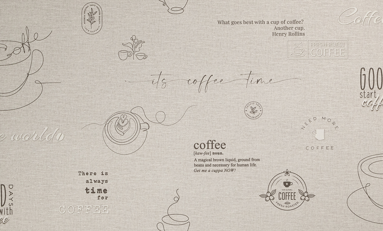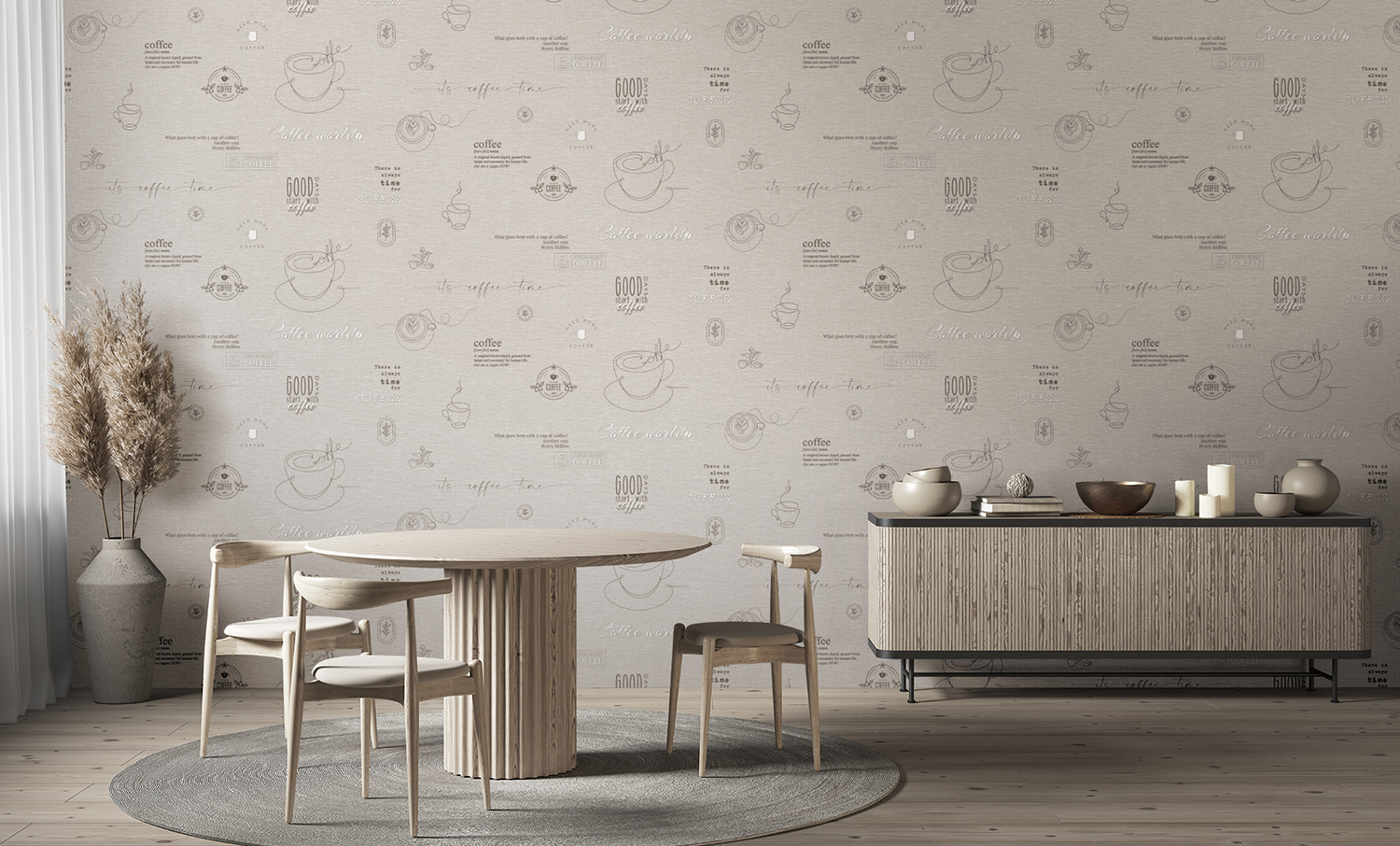 Коллекция обоев Café ТМ Ateliero — это стильное воплощение атмосферы утреннего ритуала, когда аромат свежесваренного кофе наполняет пространство теплом и вдохновением. На фоне мягкой текстильной фактуры размещены графичные линии чашек, кофейные листья и каллиграфические надписи, создающие ощущение уюта и непринуждённого общения. Обои выполнены в нейтральной природной палитре — оттенках серого, льняного и тёплого бежевого, что делает их универсальными для интерьеров сдержанного, сбалансированного дизайна. Элементы принта выглядят легко и ненавязчиво, словно наброски в блокноте бариста.