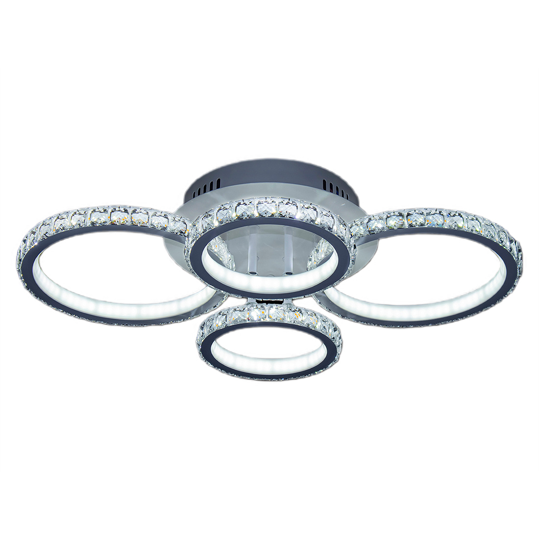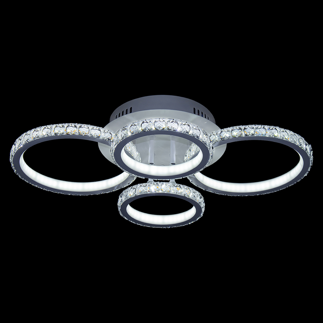 Светодиодный бытовой светильник мощностью 140 Вт. Благодаря небольшой высоте он идеально подходит для помещений с низкими потолками. Конструкция светильника состоит из круглого потолочного основания и двух пар кронштейнов в виде окружностей разного диаметра, расположенных напротив друг друга. В качестве рассеивателей света и декоративных элементов каждый кронштейн по всему периметру оснащен хрустальными подвесками (шатонами). Пульт дистанционного управления с функцией диммера позволяет регулировать интенсивность светового потока, плавно уменьшая или увеличивая яркость свечения.