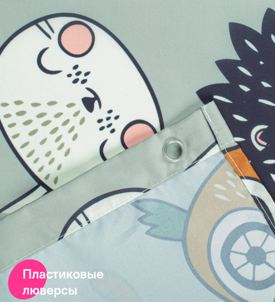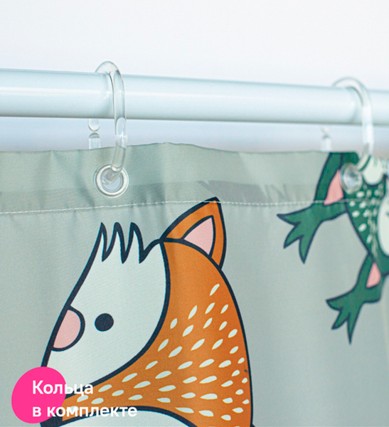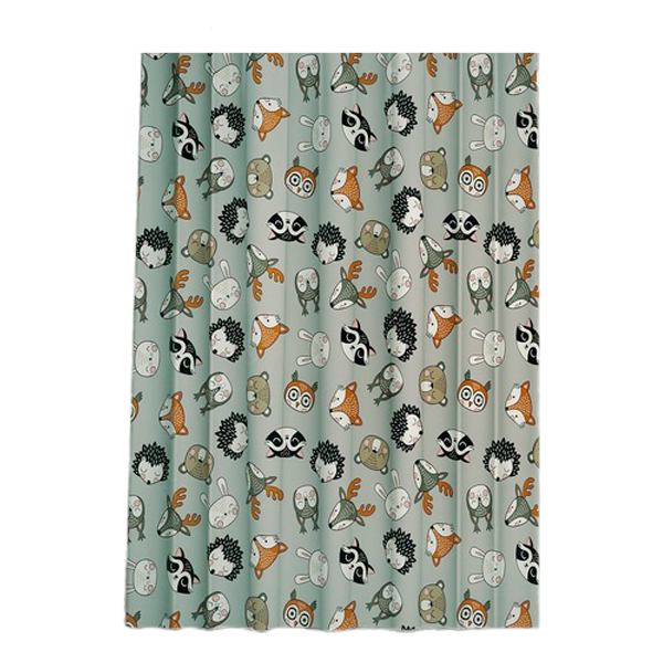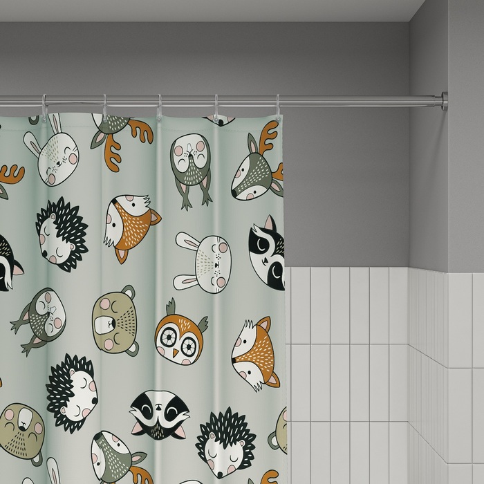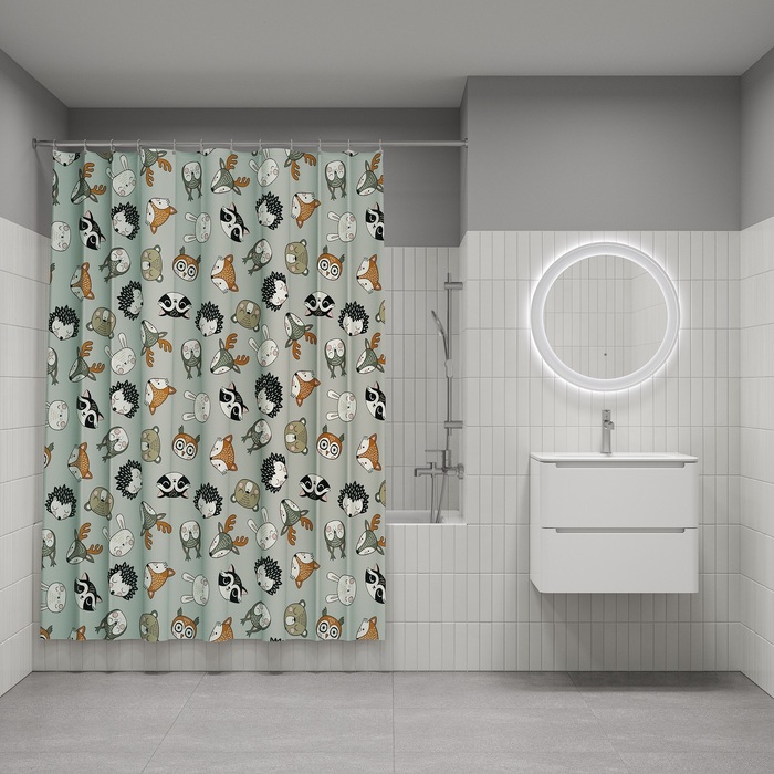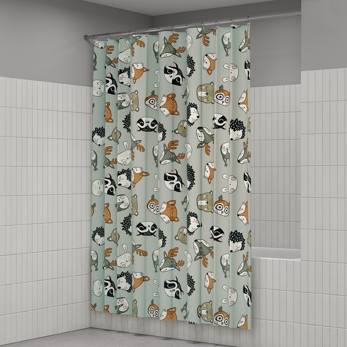 Текстильная штора для ванной светло-серого цвета с милым принтом в виде мордочек лесных зверей. Идеально подойдет для детской или семейной ванной комнаты. Изготовлена из износостойкого полиэстера с водоотталкивающей пропиткой. При попадании на ткань вода не впитывается, а скатывается каплями, даже при сильном напоре воды.