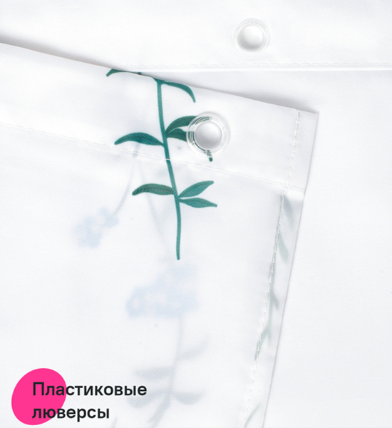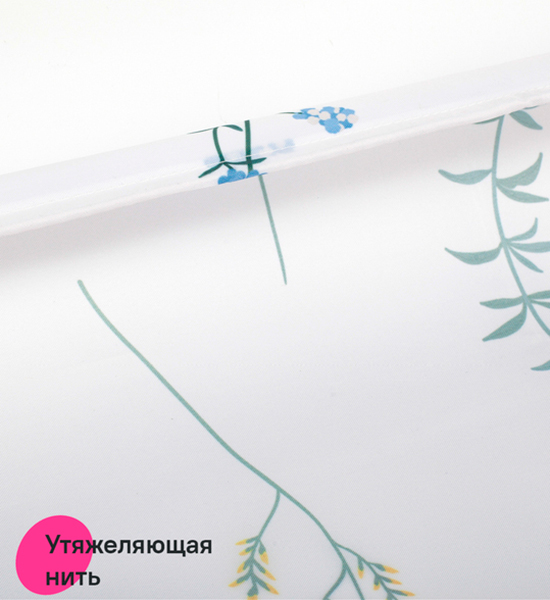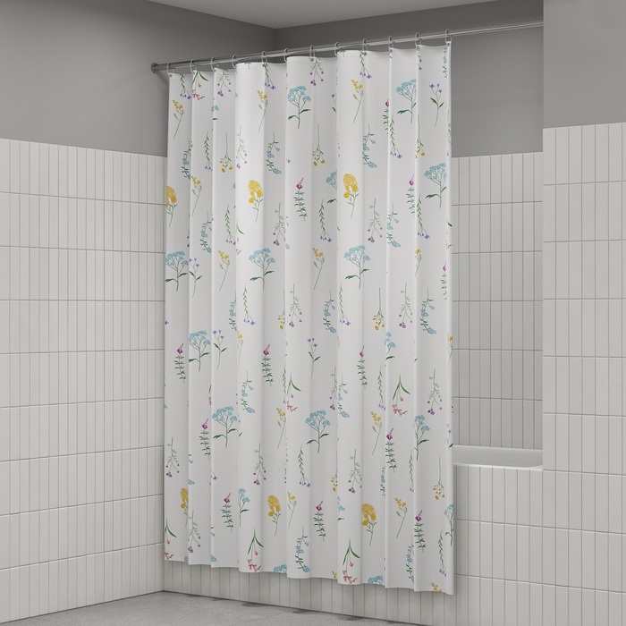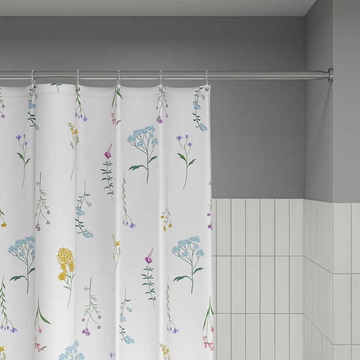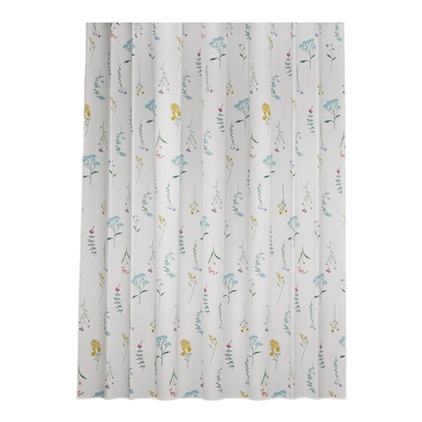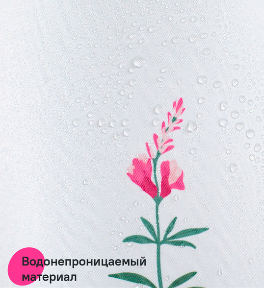 Текстильная штора для ванной белого цвета с красивым растительным узором из полевых цветов. Изготовлена из износостойкого полиэстера с водоотталкивающей пропиткой. При попадании на ткань вода не впитывается, а скатывается каплями, даже при сильном напоре воды.