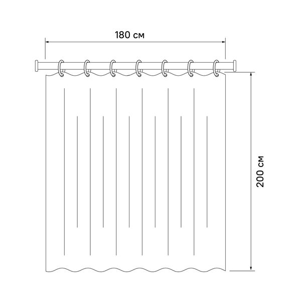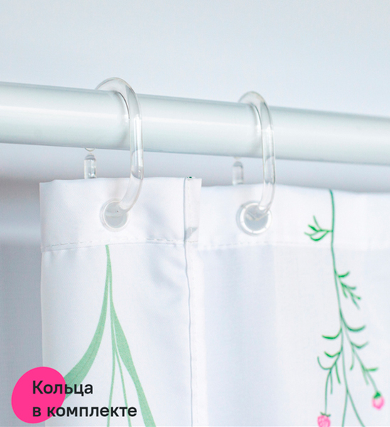 В комплекте 12 колец С-формы из прозрачного пластика. По верхнему краю расположены 12 прозрачных пластиковых люверсов. Штора имеет утяжеляющую нить по нижнему краю, которая позволяет избежать задирания ткани.