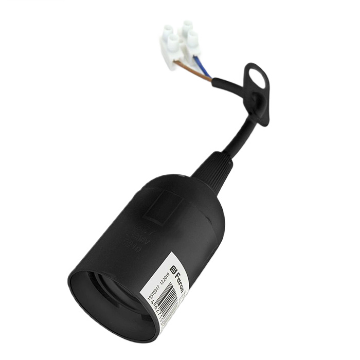 Патрон FERON LH108 — это электрический патрон стандарта E27 для ламп общего назначения. Выполнен из самозатухающего пластика черного цвета для безопасной эксплуатации. Компактный корпус с коротким проводом идеально подходит для самостоятельного изготовления светильников, переносок и ремонта электроприборов.