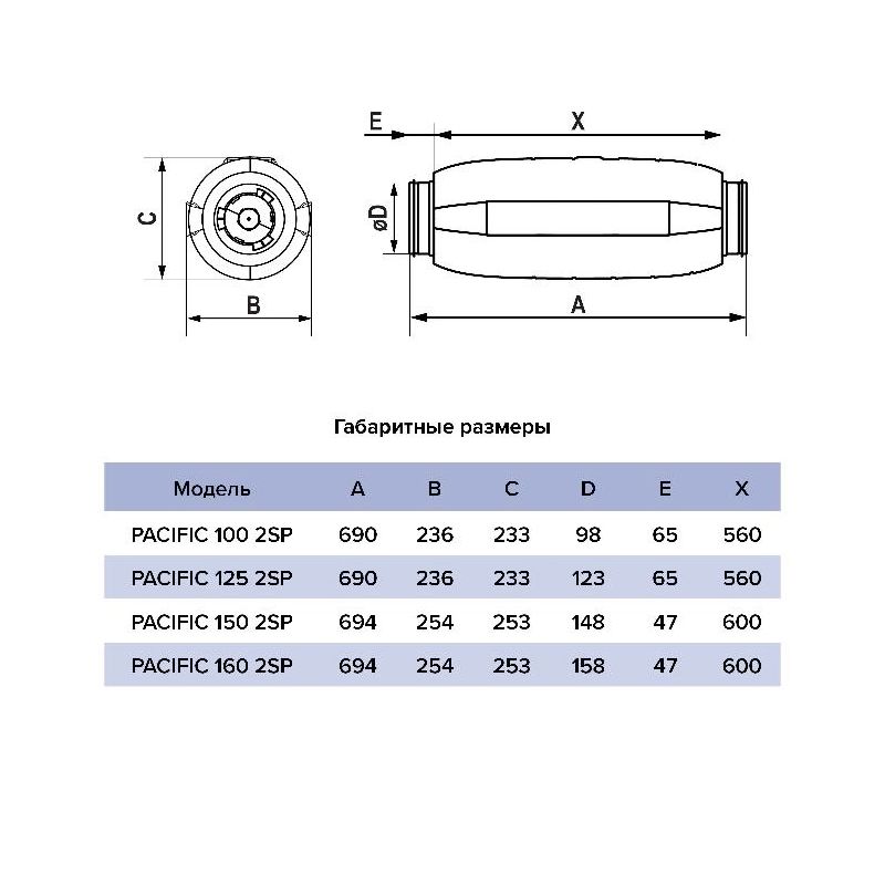 - PACIFIC с крыльчаткой смешанного типа и двухскоростным однофазным двигателем на шарикоподшипниках сочетает преимущества центробежных (высокое давление) и осевых (высокий расход воздуха) вентиляторов