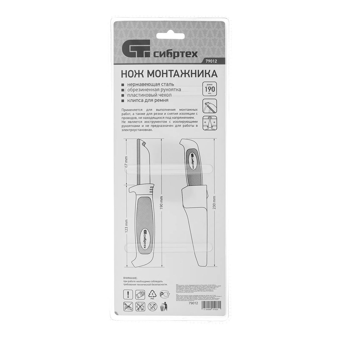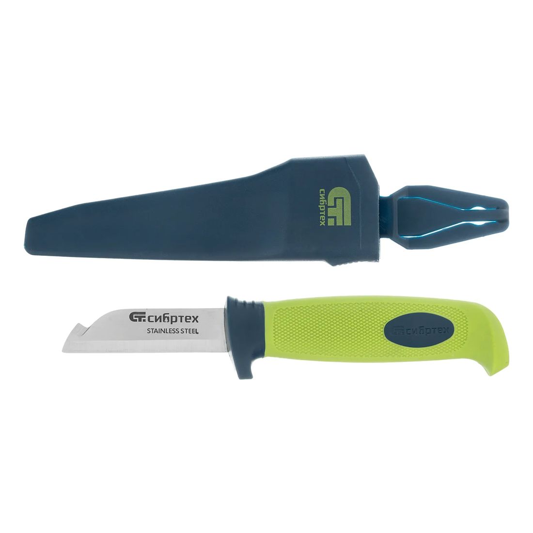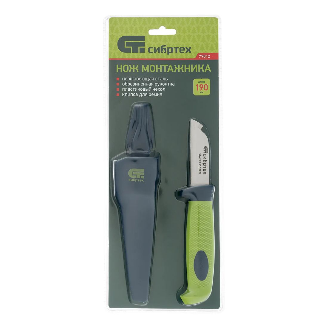 Нож монтажника Сибртех 79012 общей длиной 190 мм и длиной лезвия 67 мм, с чехлом и обрезиненной рукояткой, предназначен для работ с проводкой. С его помощью можно зачистить и обрезать кабель. Нож с пластиковым чехлом безопасен при транспортировке, поэтому его удобно брать с собой на выездные работы.