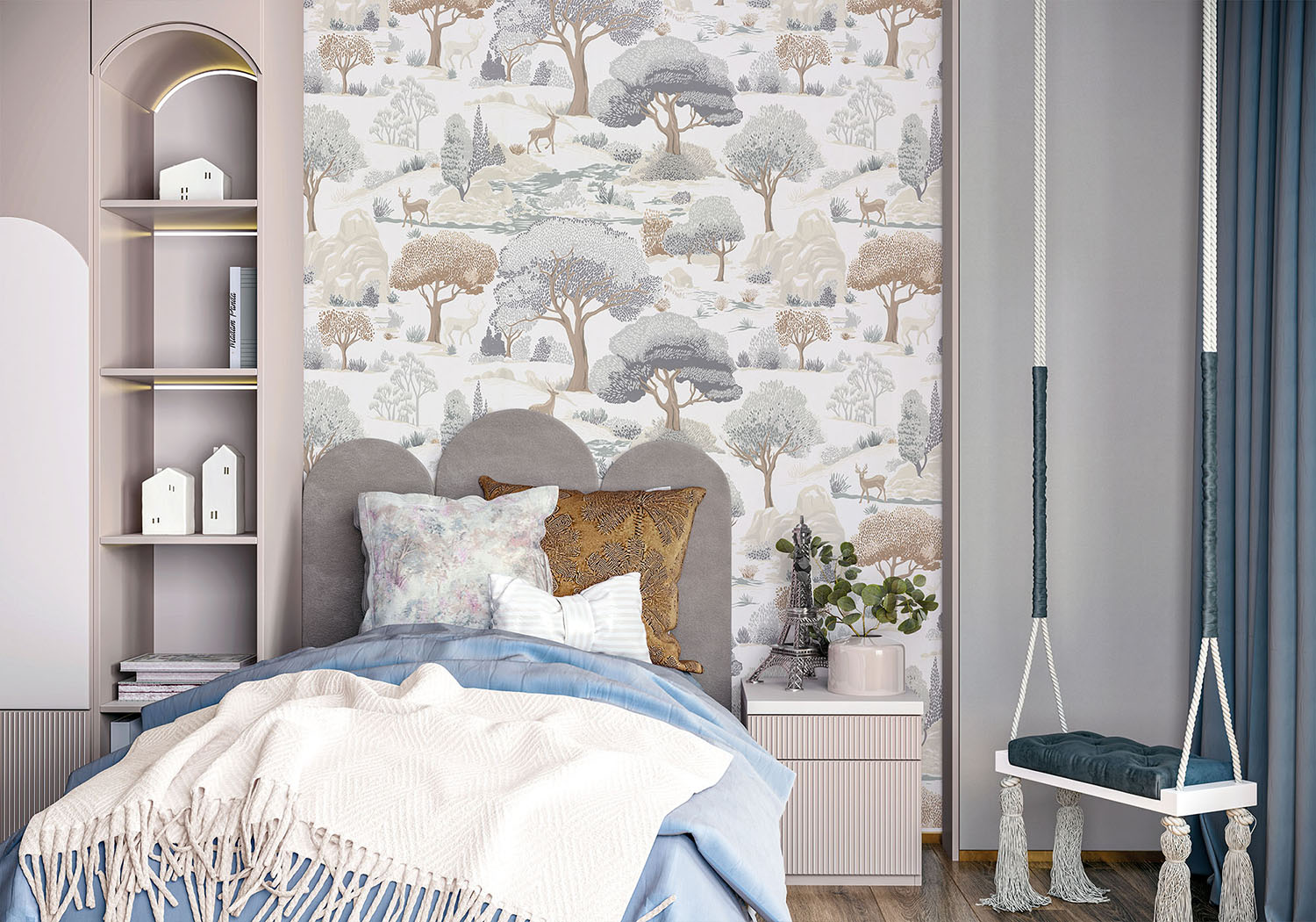 Сюжет наполнен уютной атмосферой сказочного леса – стройные деревья, скалистые холмы и изящные силуэты оленей смотрятся как иллюстрации из детских книжек. Словно созданный рукой художника-декоратора рисунок наполняет комнату природным спокойствием. Дизайн вдохновлен идеями северного nordic-стиля: выверенная простота форм, воздушные пастельные оттенки и природные акценты. Обои мягко дополнят современный интерьер, при этом оставят свободу для аксессуаров в скандинавском стиле.