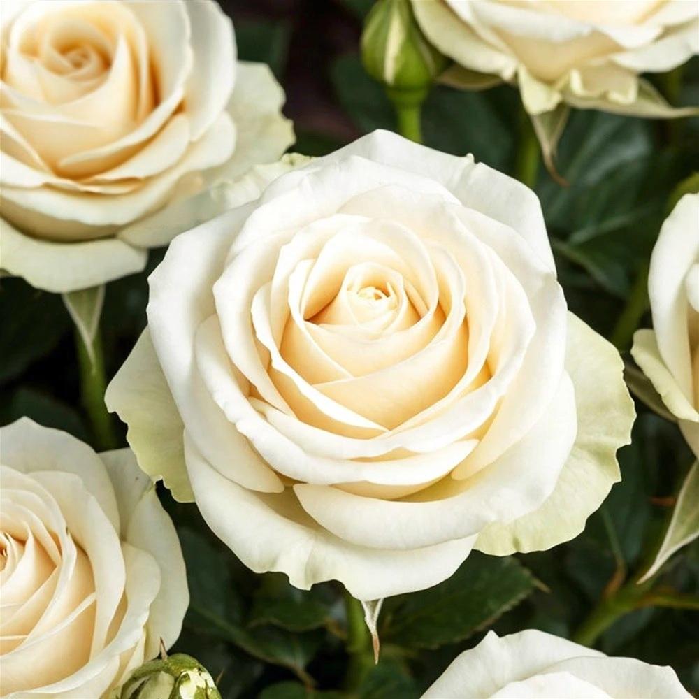 Сорт отличается эффектностью цветения. Цветет длительно, очень пышно, образуя среднемахровые бутоны с высоким бокалом, бело-сливочного цвета, с мятным оттенком. Сохраняет свежесть в срезке до 10-12 дней. Куст крепкий, плотный, сильнооблиственный, с глянцевой зеленью. Сорт легко переносит как сильную жару, так и морозы, неприхотлив к условиям выращивания, требует профилактических мероприятий против болезней.