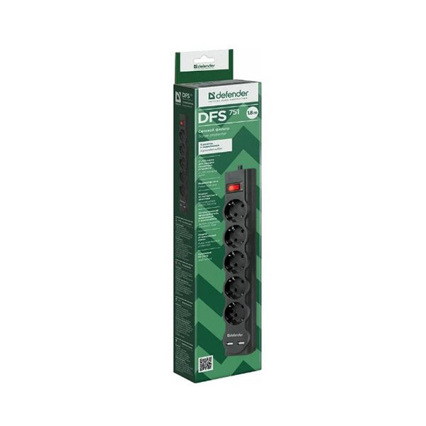 Сетевой фильтр Defender DFS 751 1,8 м, 5 розеток, 2xUSB, 2.1A 99751 экономичный вариант решения проблемы защиты электропитания и зарядки Ваших портативных устройств. Предназначен для широкого спектра бытовой и электронной техники, включая чайники и электронагреватели.