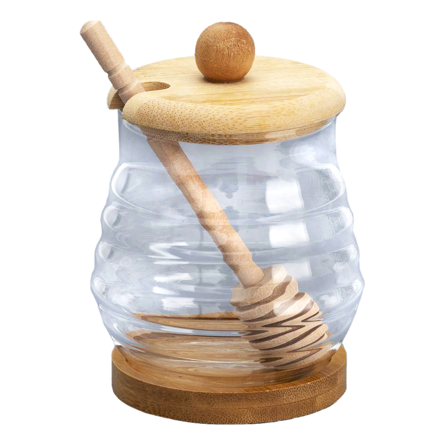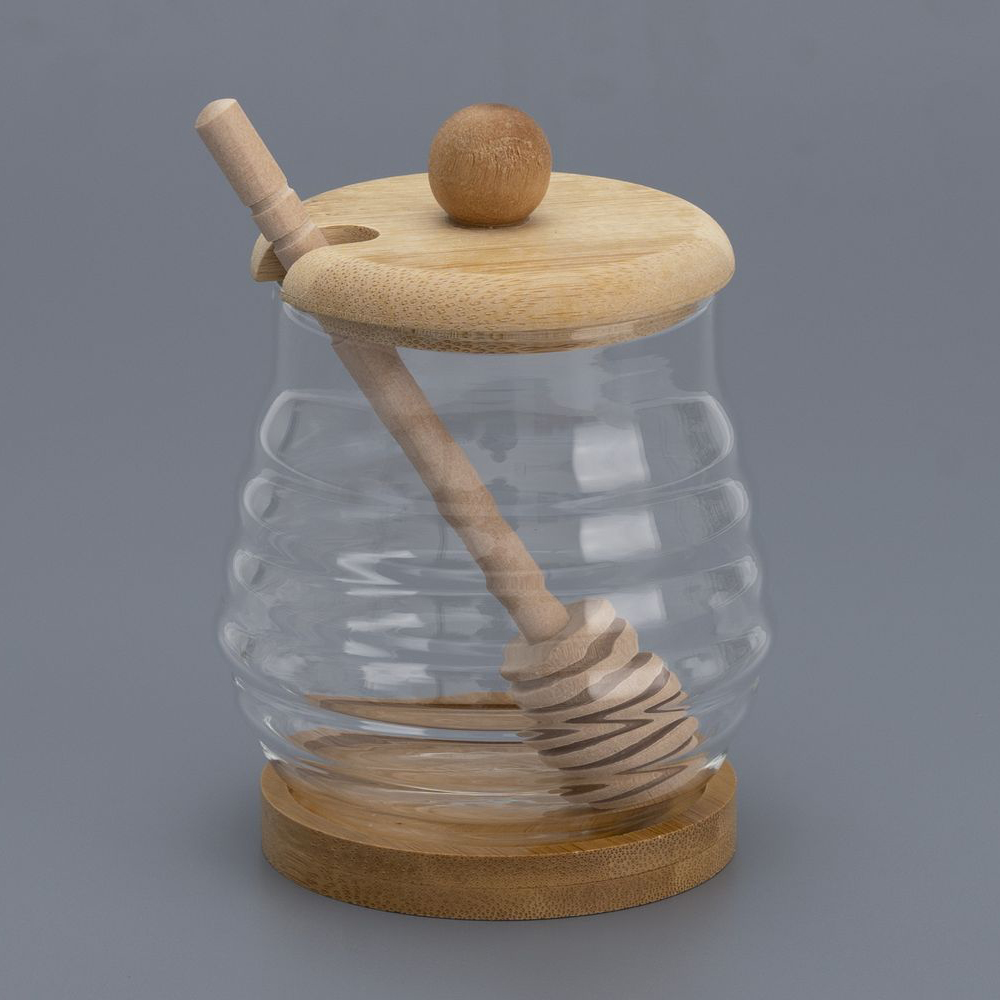 Деревянная ложка позволяет аккуратно извлекать нужное количество меда. Сама подставка из дерева служит дополнительным элементом декора, обеспечивая удобство и надежность при размещении банки на столе или полке.