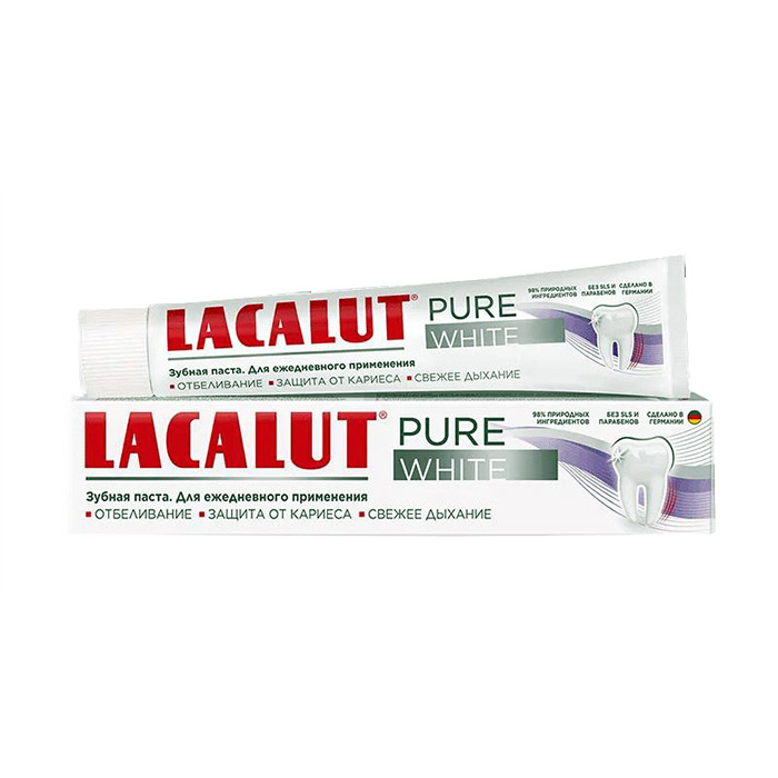 Зубная паста LACALUT® PURE WHITE с натуральным экстрактом папайи содержит активный комплекс осветляющих компонентов и мягких абразивов, который удаляет зубной налёт, предотвращает образование зубного камня и помогает восстановить естественную белизну зубов. Фторид натрия укрепляет зубную эмаль и защищает зубы от кариеса.