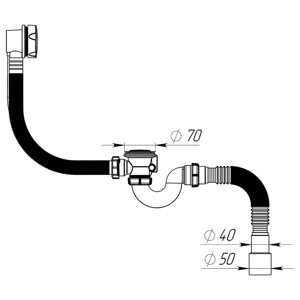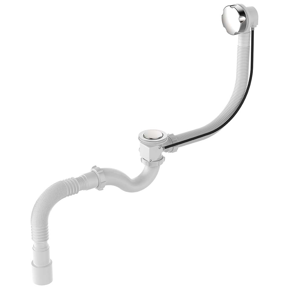 Сифон для ванн прямоточный с переливом полуавтоматом. Хромированная ручка перелива-полуавтомата соединена с заглушкой-грибком на выпуске специальным тросиком. При повороте ручки на переливе в одну сторону, грибок опускается, закрывая слив воды; при повороте в обратную сторону - грибок открывается. Выпуск сифона спроектирован под стандартный диаметр сливного отверстия на всех типах ванн Ø50мм. Подходит для всех типов ванн, в т.ч. чугунных, из-за увеличенной длины винта (27мм по резьбе). Колено сифона прямоточное, что обеспечивает беспрепятственный и быстрый сток воды, высота гидрозатвора 50 мм.