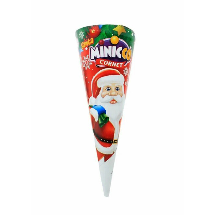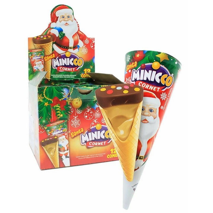 MINICICO Cornet Santa 25 г. — шоколадный десерт в хрустящем вафельном рожке, наполненный воздушным ореховым кремом и украшенный разноцветными драже. Новогодняя упаковка добавляет праздничного настроения, превращая лакомство в идеальный подарок или уютный перекус зимой. Идеален для семейного чаепития или весёлых посиделок с друзьями.