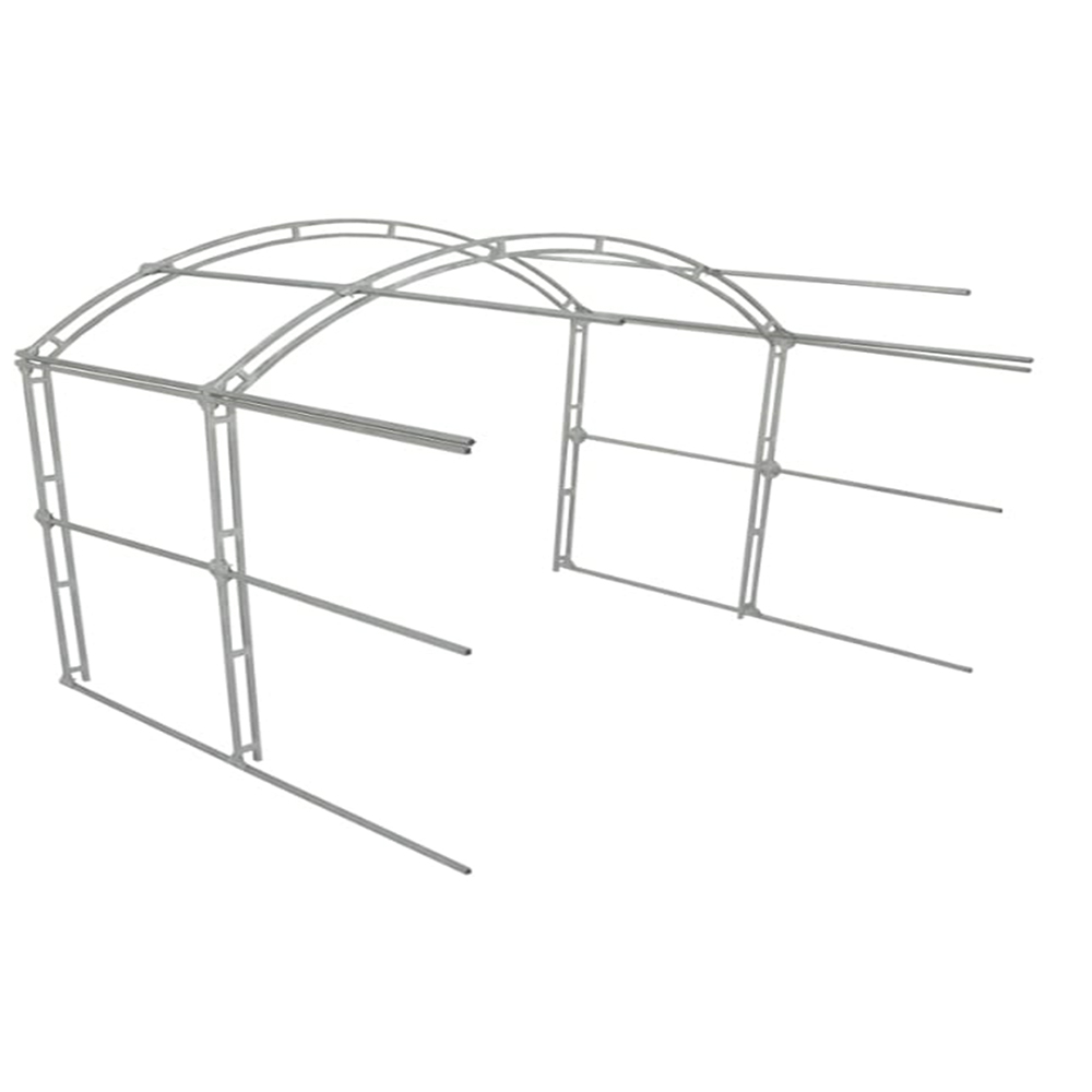 Тип каркаса: оцинкованная сталь. Труба 20*20мм. Толщина металла 0,8мм. Двойная дуга. В собранном виде ширина 3м, длина 2м, высота 2,1м. Комплектация: стрингеры 33 шт, фурнитура. Тип крепления: краб система.