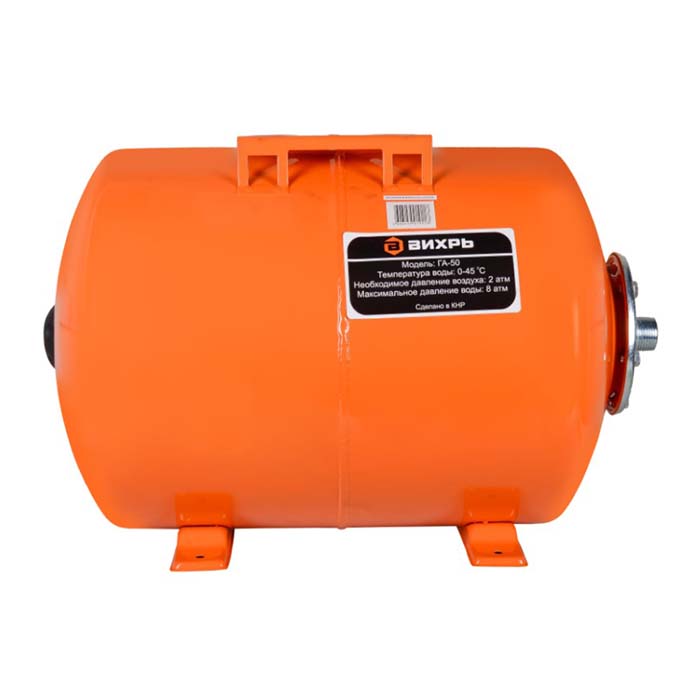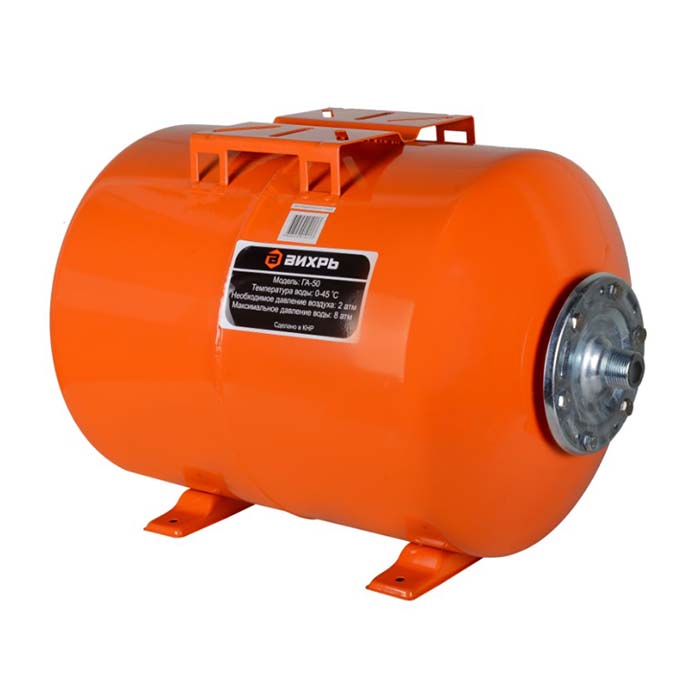 Гидроаккумулятор Вихрь ГА-50 – это емкость для накопления воды под давлением с целью сглаживания гидроударов. Его корпус изготовлен из прочной стали, оснащен мембраной из пищевой резины и пневматическим клапаном.