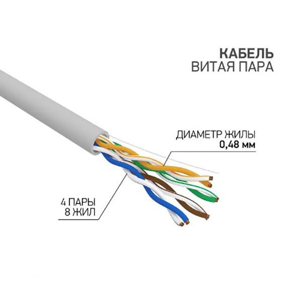 Неэкранированный кабель предназначен для прокладки внутри зданий. Относится к категории 5е: рассчитан на рабочие частоты до от 1 до 100 МГц.