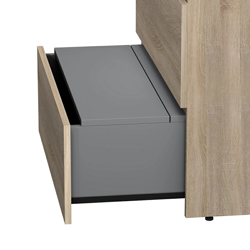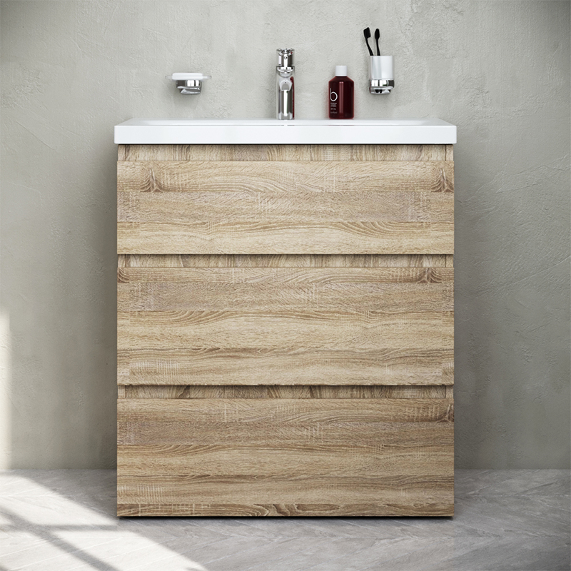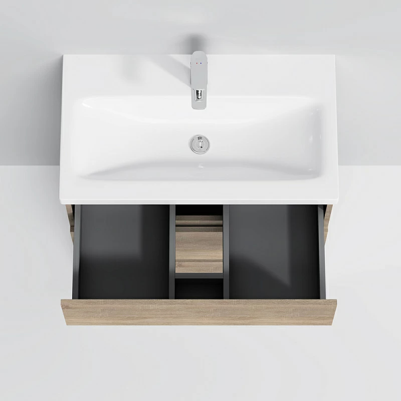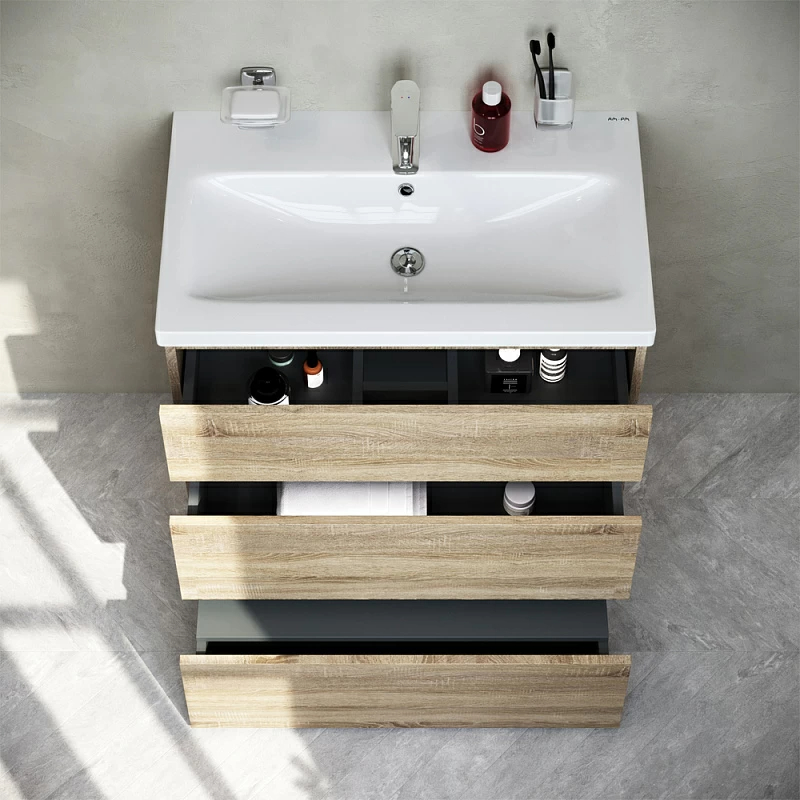 Современный европейский дизайн от DanelonMeroni (Великобритания/Италия). Уникальный нижний ящик базы может быть использован как: выдвижная подставка для детей, для удобного мытья рук (выдерживает нагрузку до 60 кг), дополнительная ниша для хранения (экономия пространства ванной комнаты). Ящики с антискользящим покрытием цвета антрацит – европейский стандарт. Материал изделия - влагостойкая плита мебели в цвете светлый дуб. Тумба комплектуется мебельной раковиной Gem M90WCC0752WG.