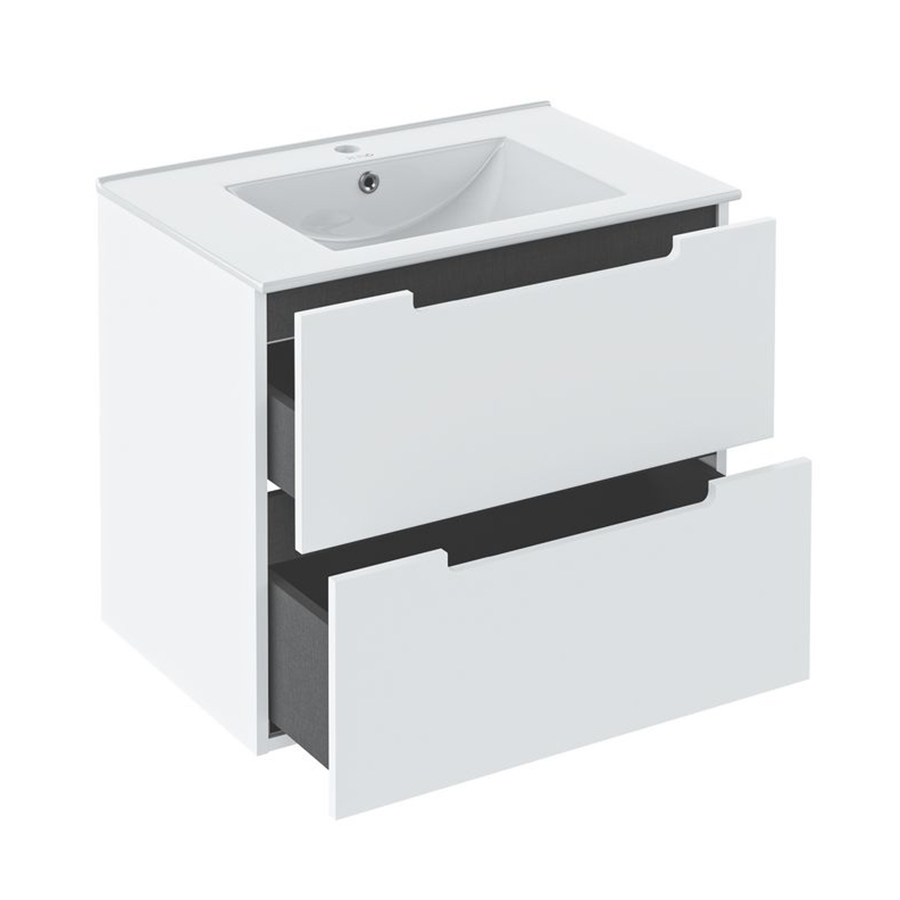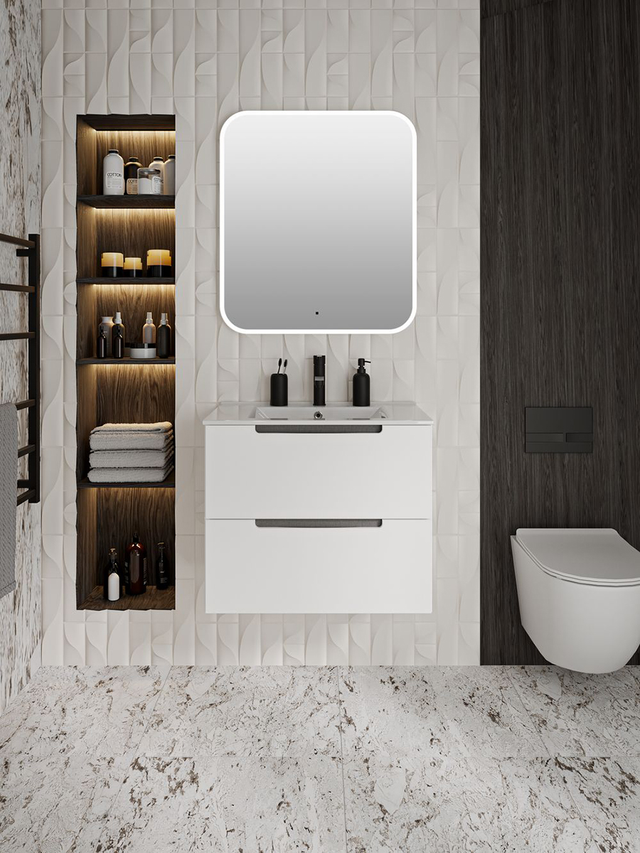 Тумба под раковину Lina (подвесная) — это стильное сочетание классических и модных тенденций в оформлении ванной комнаты. Форма тумбы классическая прямоугольная, тумба оснащена двумя выдвижными ящиками на шариковых направляющих, оснащенных системой плавного закрывания. Ручки тумбы интегрированные, в сочетании с углублённой фальш-панелью контрастного серого цвета выглядят стильно и необычно.