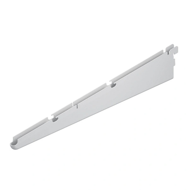 Белый кронштейн для установки различных полок и корзин. Элемент, связывающий наполнение гардеробной системы со стойками. Для установки таких кронштейнов вам необходимо подобрать подходящий размер кронштейна, согласно размеру полок или корзин и вставить его в перфорацию стойки на нужном расстоянии.
