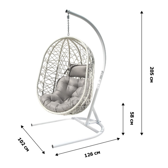 Подвес осуществляется на металлической цепи, которая надежно удерживает корзину. Внутри корзины размещен мягкий матрас с чехлом из водоотталкивающей ткани серого цвета. Наполнитель — синтепон — обеспечивает достаточную мягкость и сохраняет форму. Комплект дополнен декоративной подушкой в тон.