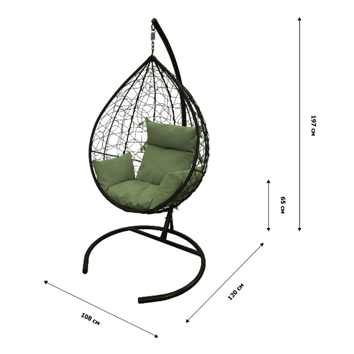Подвес осуществляется на металлической цепи, которая надежно удерживает корзину. Внутри корзины размещен мягкий матрас с чехлом из водоотталкивающей ткани зелёного цвета. Наполнитель — синтепон — обеспечивает достаточную мягкость и сохраняет форму.