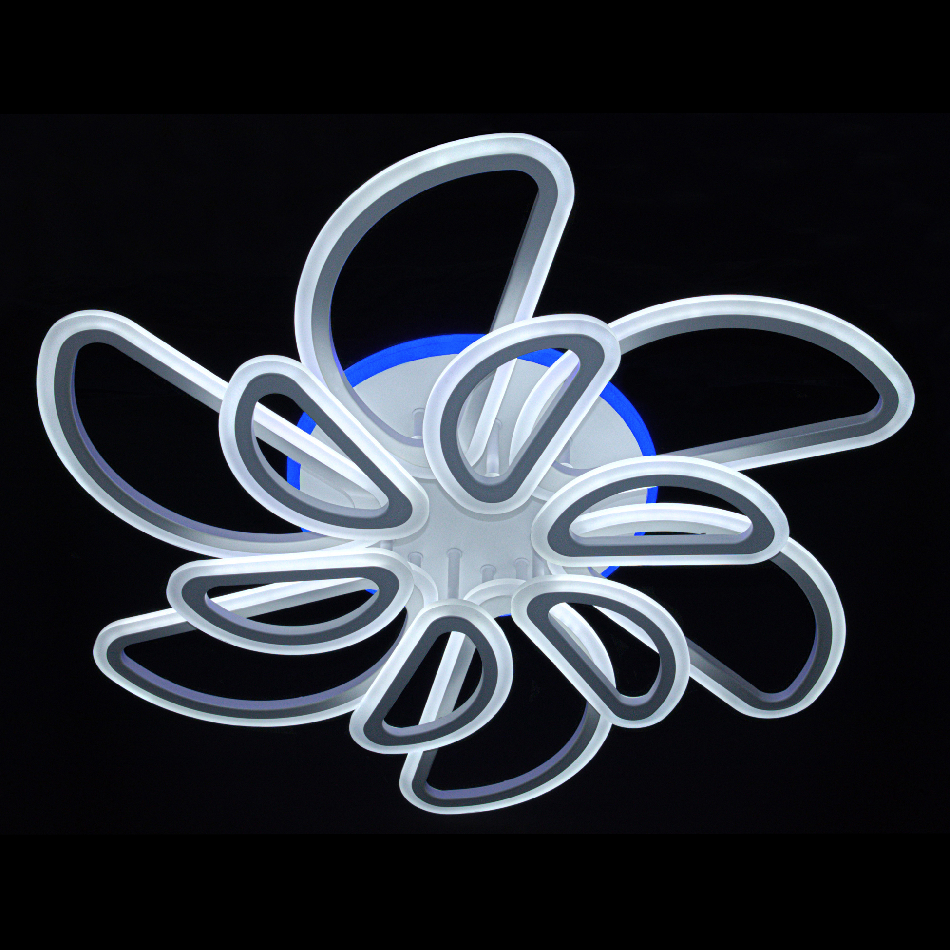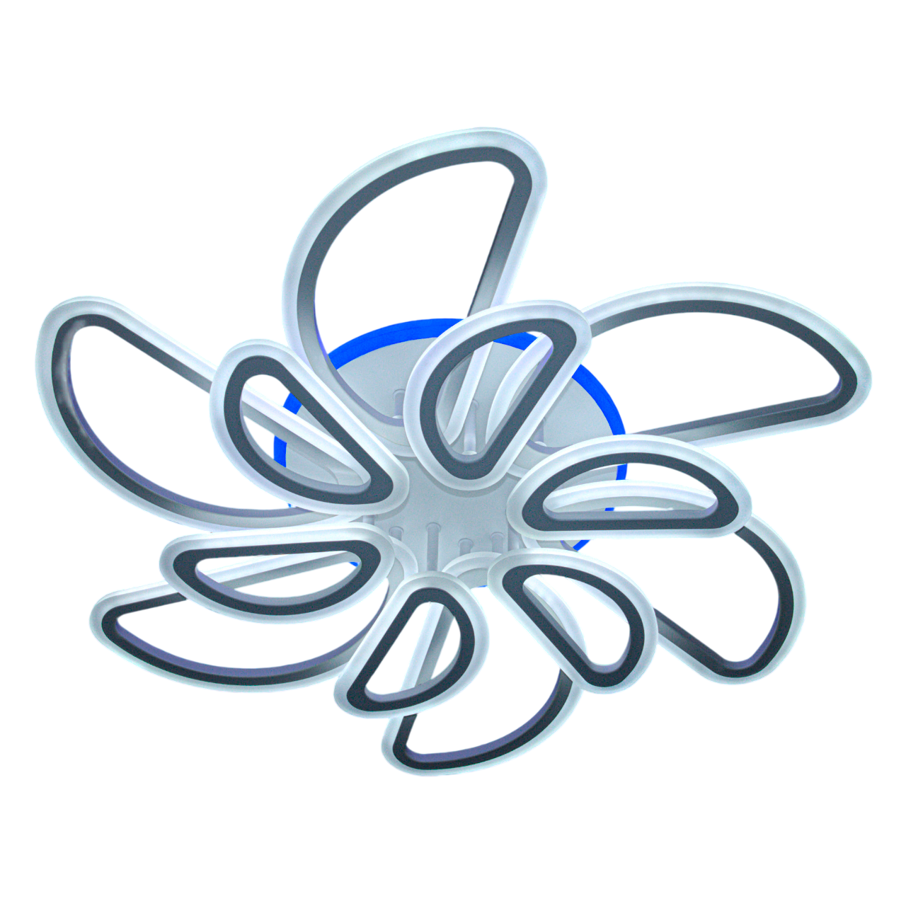 Светодиодный светильник бытового предназначения мощностью 160 Вт за счет маленькой высоты идеально подходит для низких потолков. Светильник состоит из круглого потолочного основания белого цвета с функцией RGB подсветки и 12 кронштейнов в виде лепестков разного размера (6+6) геометрической формы. Крепление - перфорированная планка. Пульт с функцией диммера на 4 светильника позволяет настроить световые режимы данной люстры в сторону уменьшения или увеличения светового потока.