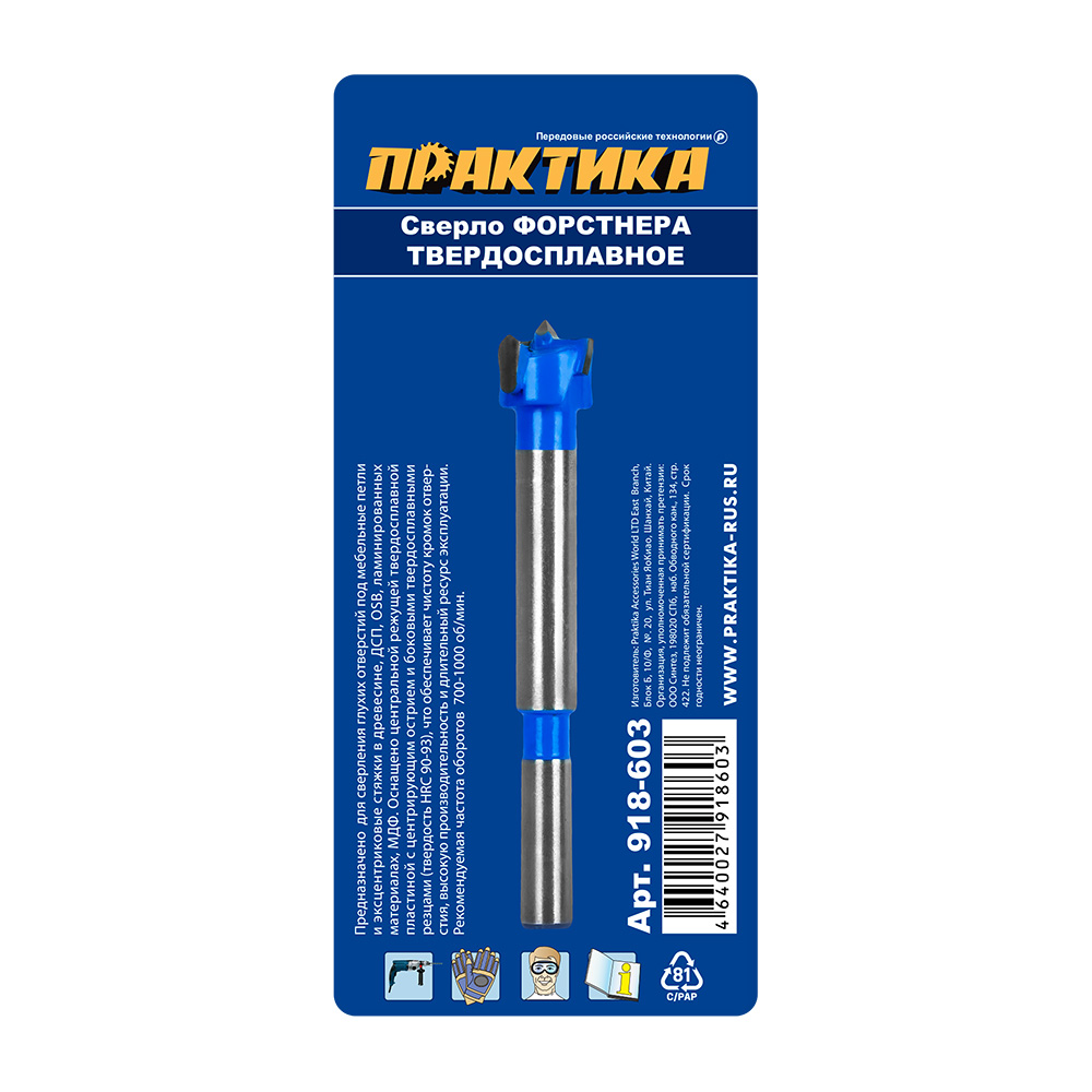 Сверло петельное Форстнера твердосплавное ПРАКТИКА 918-603 применяется для сверления отверстий в мягкой и твердой древесине, древесине покрытой шпоном, ДСП, ламинированном ДСП. Предназначено для точного сверления глухих отверстий. Сверло оснащено боковыми режущими кромками и центрирующим острием. Обеспечивает высокое качество реза без сколов и хороший отвод стружки.