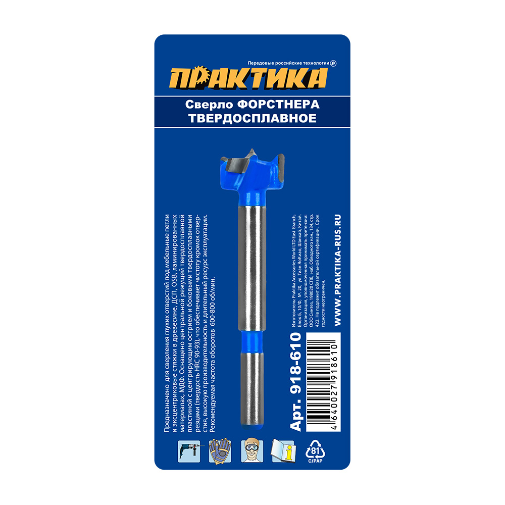 Сверло петельное Форстнера твердосплавное ПРАКТИКА 918-610 применяется для сверления отверстий в мягкой и твердой древесине, ДСП, ламинированном ДСП. Предназначено для точного сверления глухих отверстий. Сверло оснащено боковыми режущими кромками и центрирующим острием. Обеспечивает высокое качество реза без сколов и хороший отвод стружки.