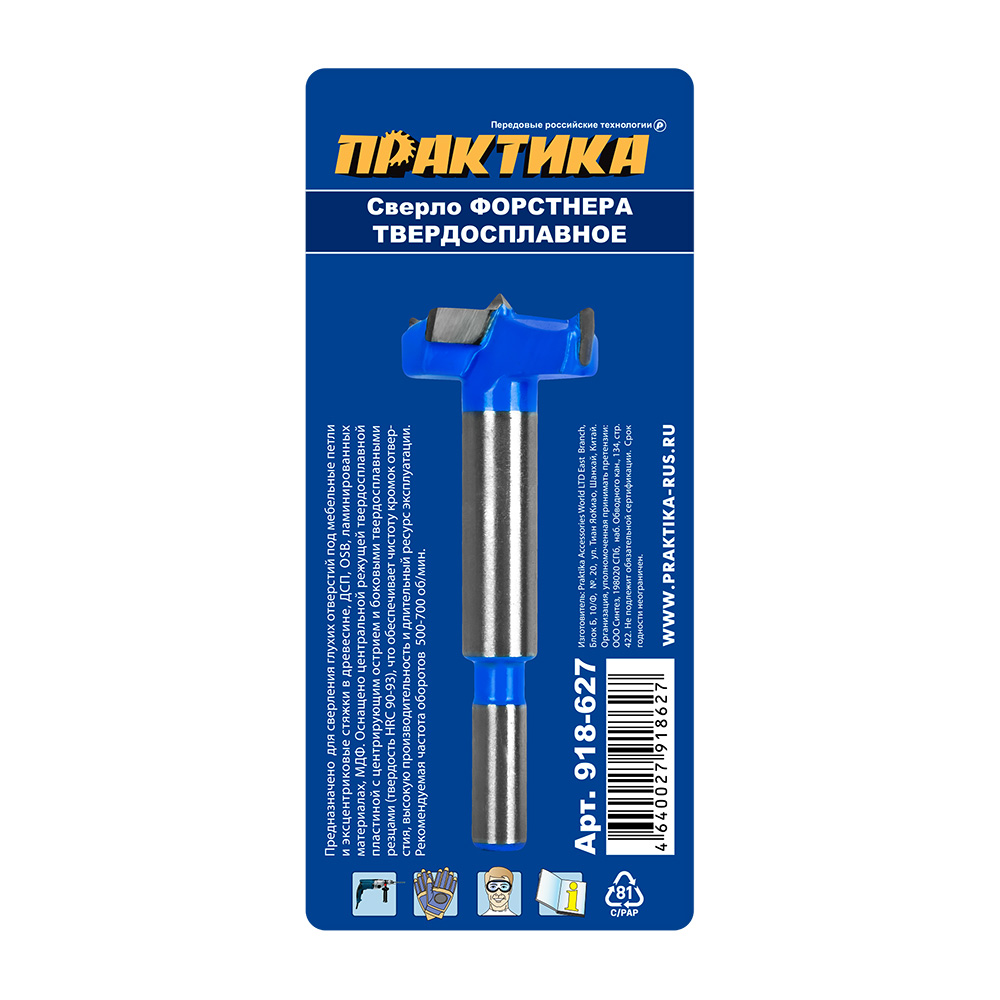 Сверло петельное Форстнера твердосплавное ПРАКТИКА 918-627 применяется для сверления отверстий в мягкой и твердой древесине, ДСП, ламинированном ДСП. Предназначено для точного сверления глухих отверстий. Сверло оснащено боковыми режущими кромками и центрирующим острием. Обеспечивает высокое качество реза без сколов и хороший отвод стружки.