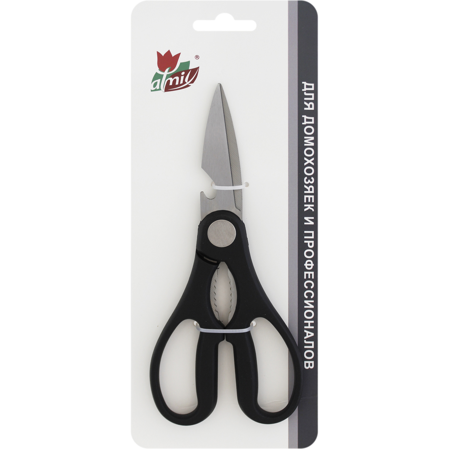 Ножницы кухонные универсальные с продуманной конструкцией позволяют измельчать зелень, разделывать птицу, рыбу, резать и вскрывать упаковки с продуктами, а также выполнять другие операции, связанные с приготовлением пищи. Модель обладает пластиковыми колечками, которые удобно лежат в ладони и не выскальзывают из нее. Лезвия изготовлены из нержавеющей стали, отличаются увеличенной прочностью.