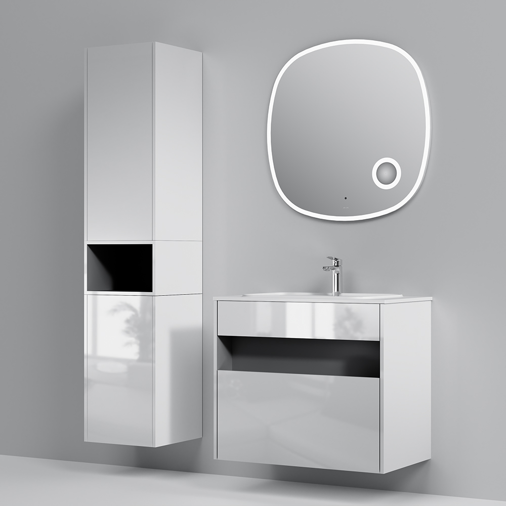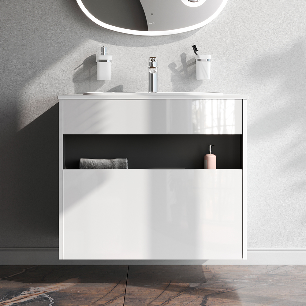 Тумба под раковину оснащена удобным выдвижным ящиком и вместительной открытой нишей, позволяющими хранить все необходимые средства под рукой. Невероятно мягкое открытие и закрытие благодаря направляющим скрытого монтажа с системой soft close.