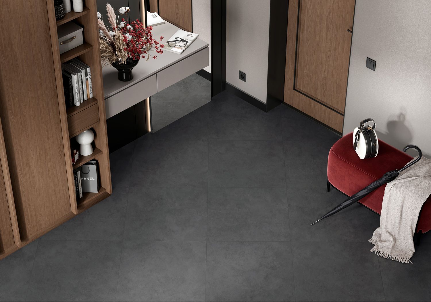 Два серых оттенка для современного интерьера. Мелкофактурный бетон — мягкая, но выразительная текстура без излишней грубости. Матовая поверхность со спецэффектом carving — практичная, устойчивая к износу, приятная тактильно. Форматы 600x600 и 600x1200 мм — гибкость в использовании для пола, стен и комбинированных решений.