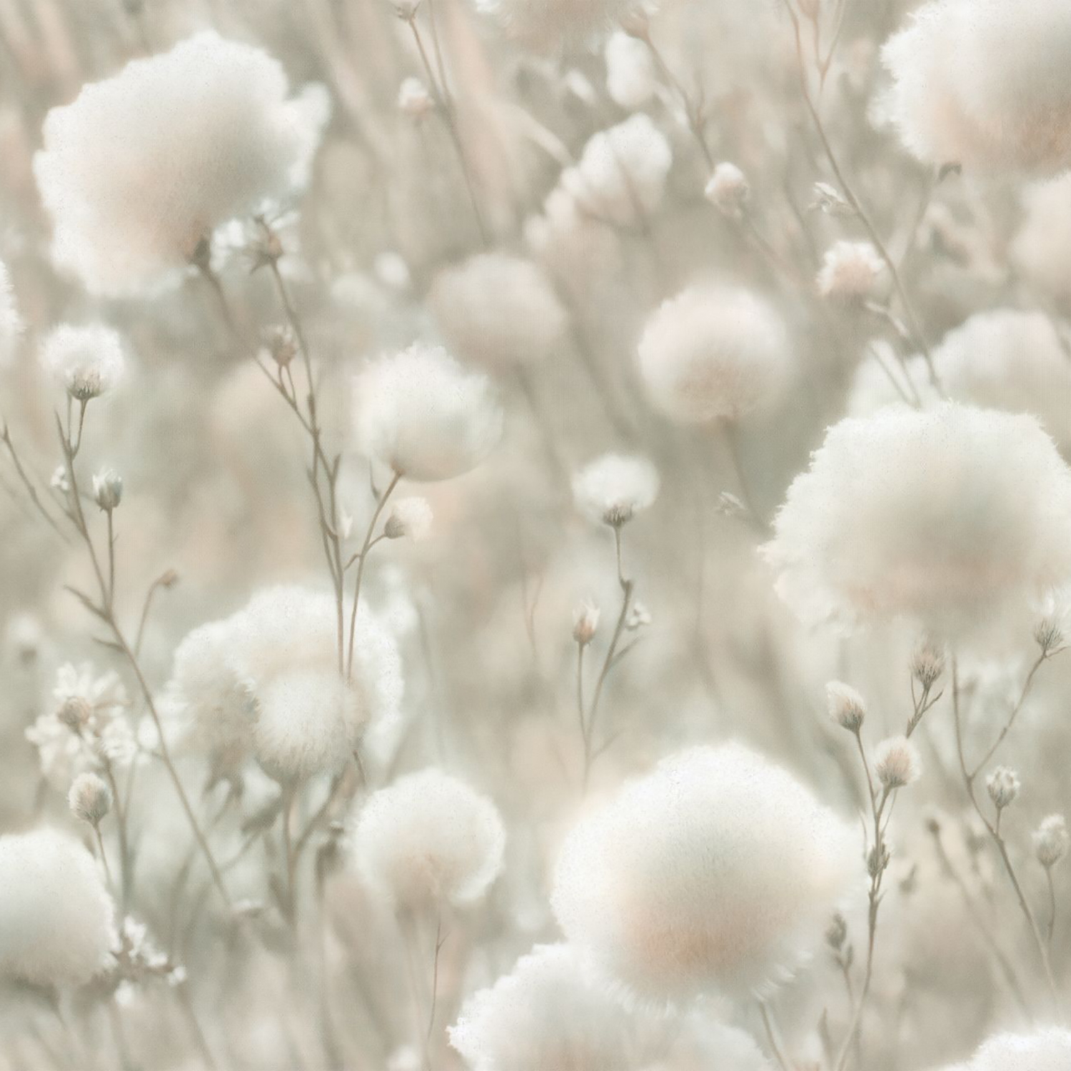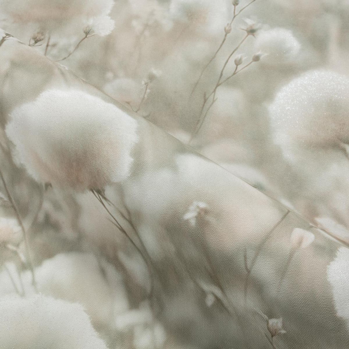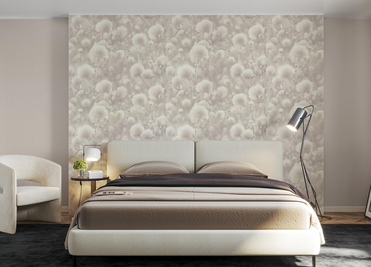 Воздушные соцветия хлопка, окутанные туманной дымкой, наполняют интерьер домашним уютом. Теплый пушистый мотив дышит нежностью летнего утра. Многоплановый рисунок Cottonia отрисован с фотографической точностью и создает эффект единого панно. Соцветия хлопка покрыты легким перламутровым мерцанием, которое подчеркивает их объем. При смене освещения рисунок словно оживает — свет мягко скользит по волокнам хлопка, изысканно раскрывая естественную фактуру мотива. Фон с деликатной вертикально направленной текстурой визуально вытягивает стены.