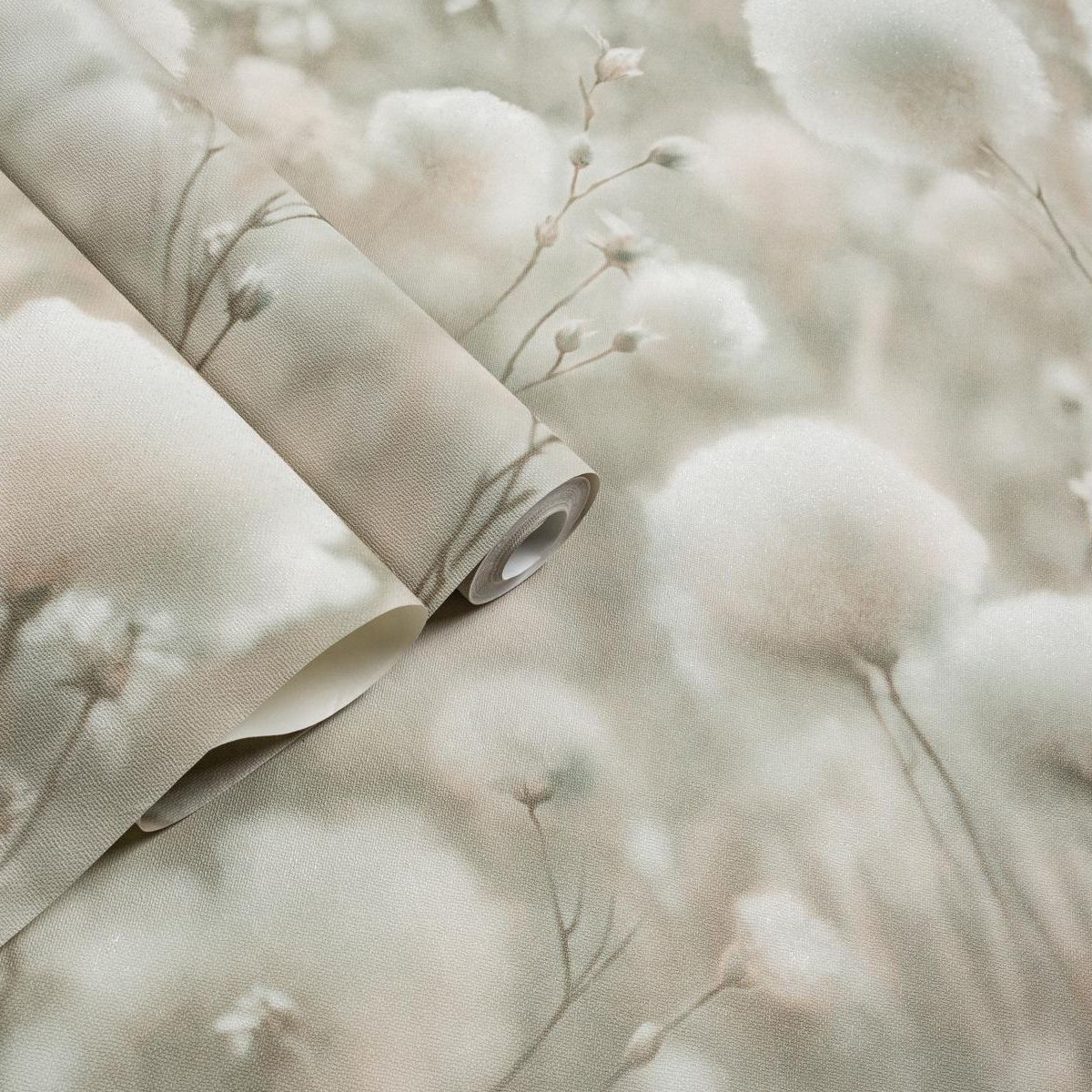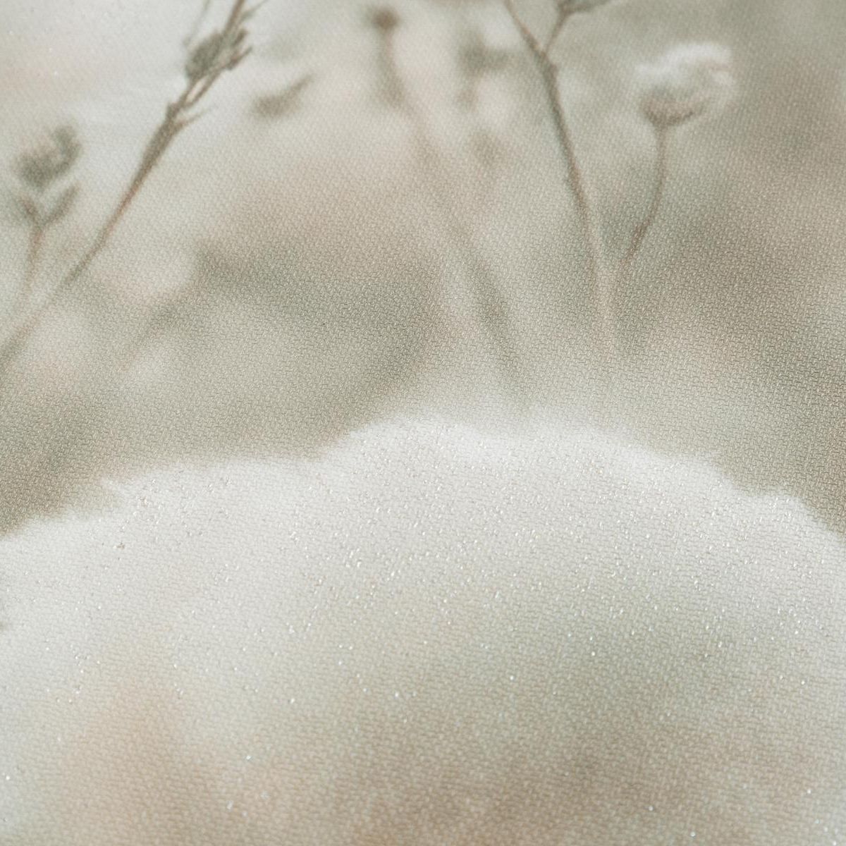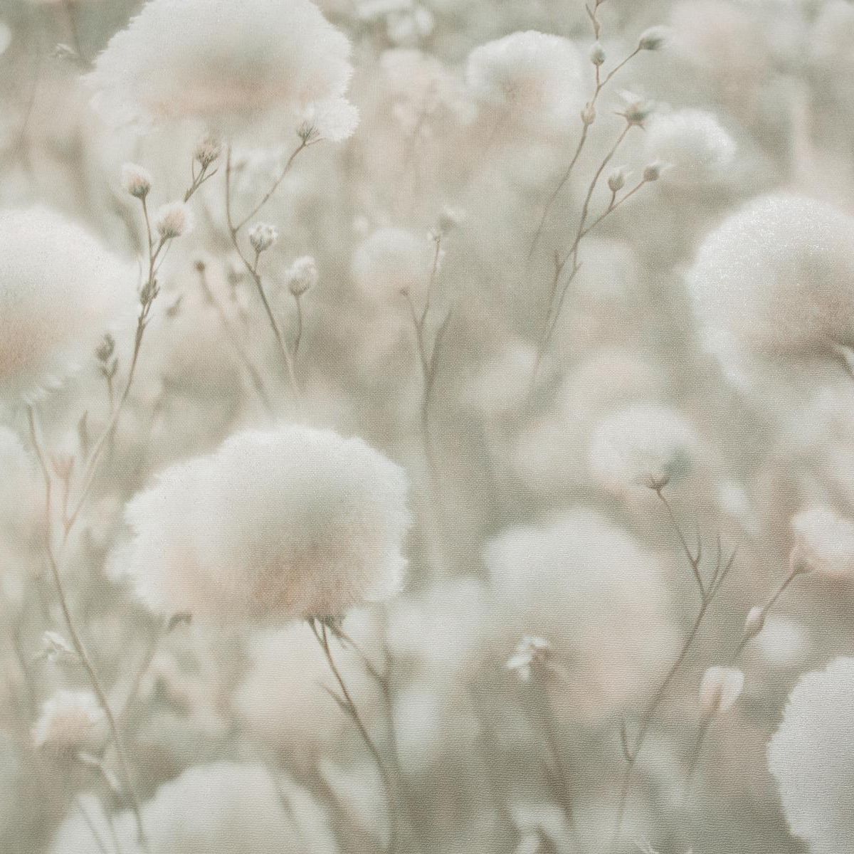 Воздушные соцветия хлопка, окутанные туманной дымкой, наполняют интерьер домашним уютом. Теплый пушистый мотив дышит нежностью летнего утра. Многоплановый рисунок Cottonia отрисован с фотографической точностью и создает эффект единого панно. Соцветия хлопка покрыты легким перламутровым мерцанием, которое подчеркивает их объем. При смене освещения рисунок словно оживает — свет мягко скользит по волокнам хлопка, изысканно раскрывая естественную фактуру мотива. Фон с деликатной вертикально направленной текстурой визуально вытягивает стены.