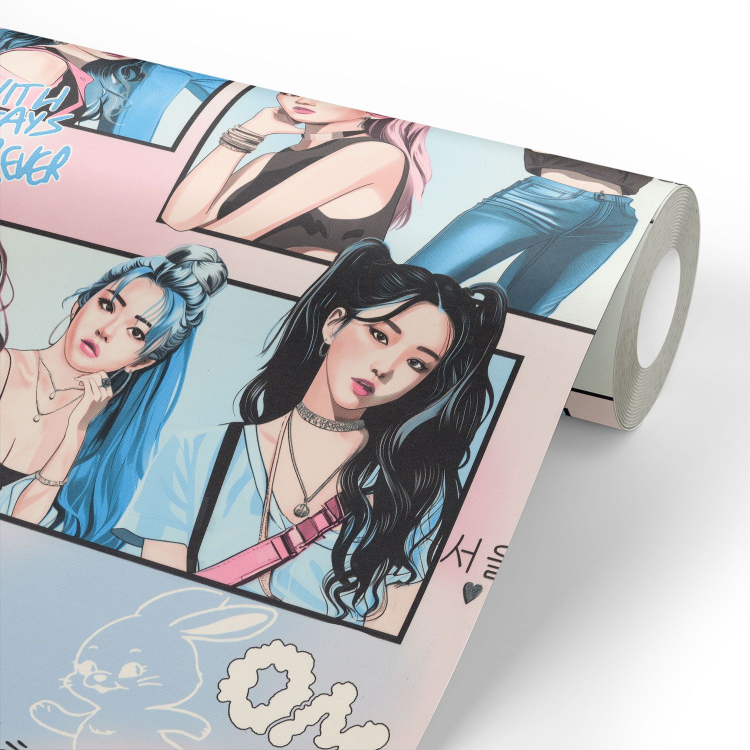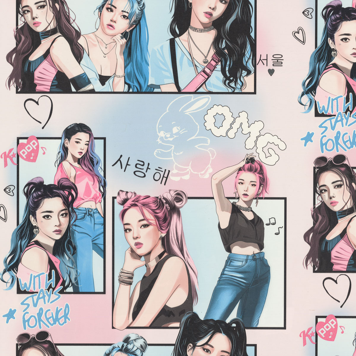 Коллекция обоев «Idols» — это яркое воплощение эстетики современной K-pop культуры. Эти обои переносят атмосферу южнокорейской сцены в интерьер, объединяя моду, музыку и дизайн в одном полотне. На полотнах изображены стилизованные силуэты айдолов в динамичных позах. Графика выполнена в стиле комиксов: крупные выразительные глаза, акцент на деталях одежды и причёсках с добавлением элементов поп-культуры — надписей, сердец и облаков.