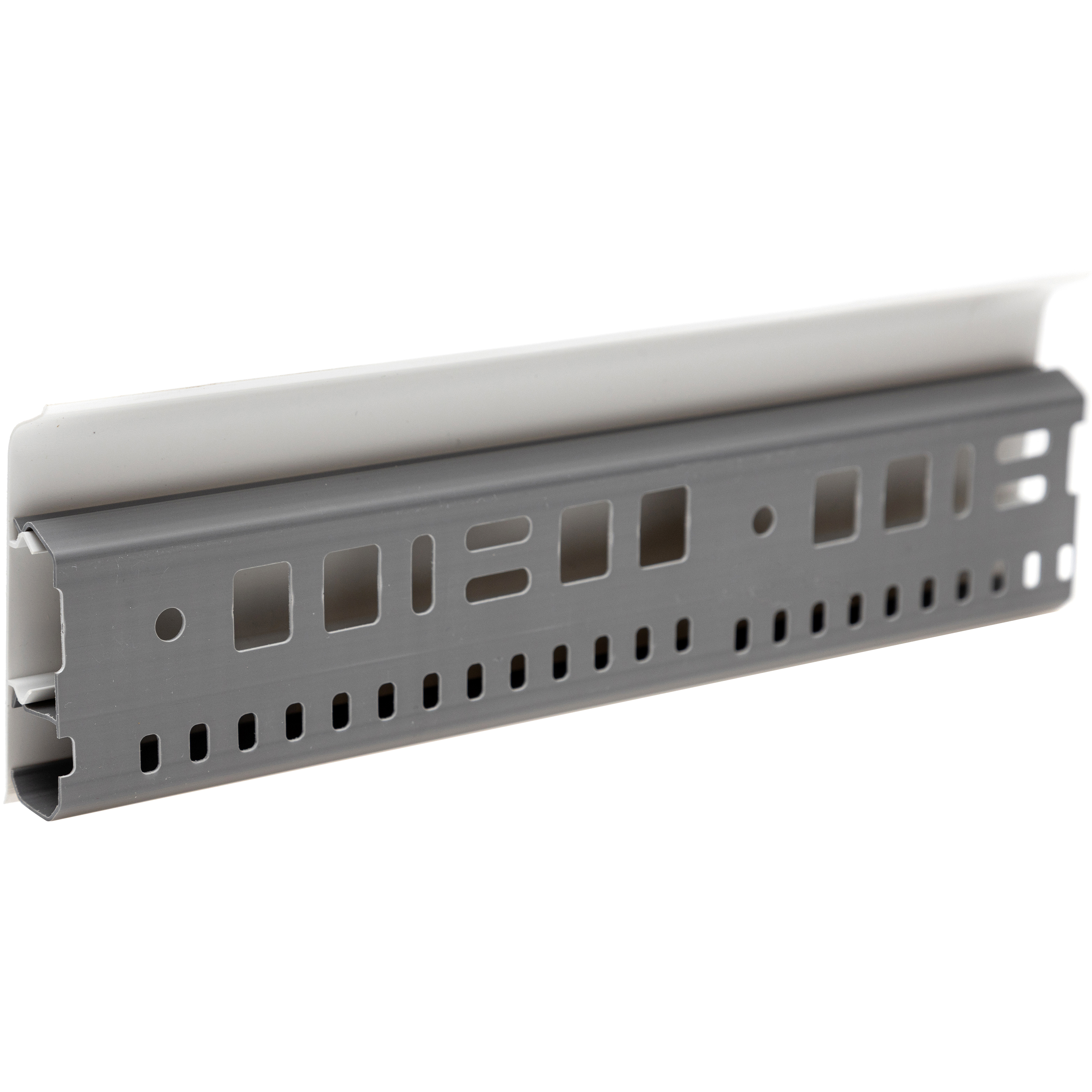 Плинтус QVANT состоит из монтажного профиля и цельной лицевой части. Такая конструкция позволяет скрыть крепеж и коммуникации. Фронтальный профиль легко снимается, что дает быстрый доступ к коммуникациям и возможность проводить работы с отделкой стен без демонтажа плинтуса.