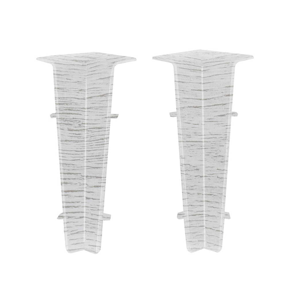 Угол внутренний — декоративный элемент, которой потребуется купить для монтажа пластикового напольного плинтуса. Обычно в помещении чётное количество углов, поэтому этот аксессуар продаётся комплектом из двух штук. Изделие устанавливают в последнюю очередь, уже после того как плинтус прикрепят к стене. Оно имеет конструкцию, позволяющую поставить его на место без применения клея или самореза, простым нажатием сверху вниз.