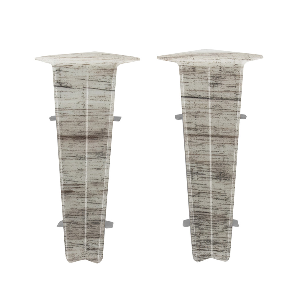 Угол внутренний — декоративный элемент, которой потребуется купить для монтажа пластикового напольного плинтуса. Обычно в помещении чётное количество углов, поэтому этот аксессуар продаётся комплектом из двух штук. Изделие устанавливают в последнюю очередь, уже после того как плинтус прикрепят к стене. Оно имеет конструкцию, позволяющую поставить его на место без применения клея или самореза, простым нажатием сверху вниз.