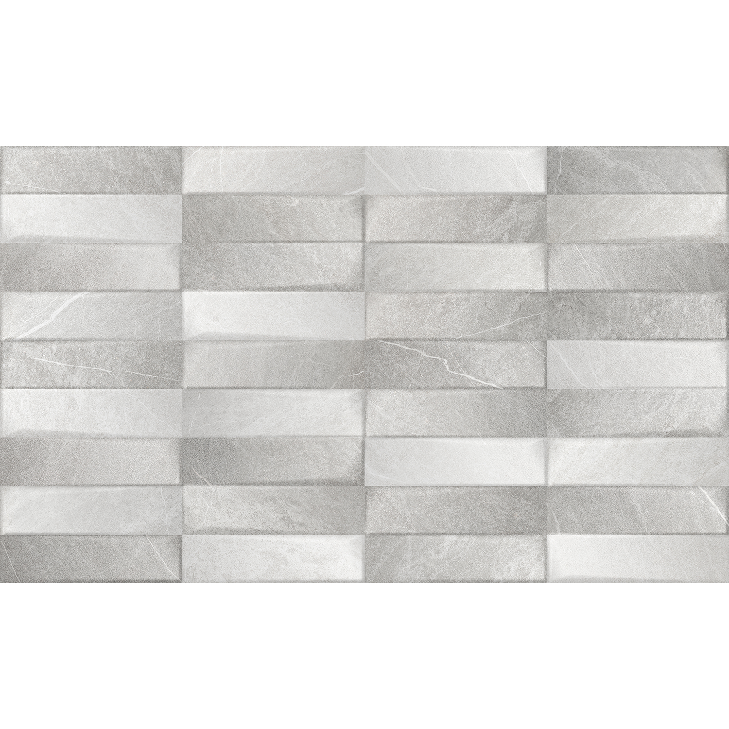 В качестве декора используется плита такого же формата с современным геометрическим орнаментом. Особенно полно он раскрывается в ковре, когда стыкуясь друг с другом на плитках вырисовываются крупные, играющие на свету серебристо-перламутровые ромбы. Акцентная плитка коллекции имеет рельеф из крупных разнонаправленных прямоугольников с объемными выступающими вершинами.
