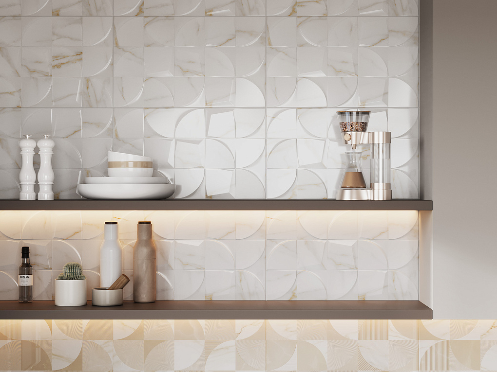 Декоративным фоном выступает мультитекстурная плитка с радиально-геометрическим орнаментом. Она выглядит эффектно из-за блеска поверхности некоторых объемных элементов, который возникает за счёт игры света на микрорельефе из органических реакционных чернил.