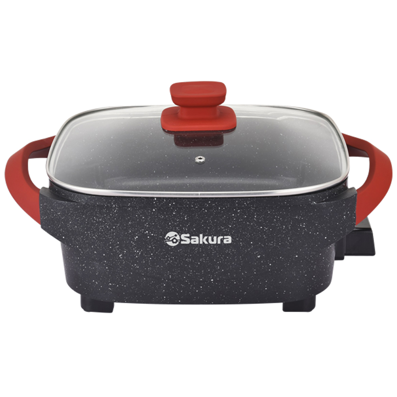 Электросковорода мощностью 1800–2000 Вт, размером 30 × 30 см и глубиной 10 см. Объём рабочей поверхности — 6,5 литров. Управление осуществляется вручную, благодаря чему легко контролировать процесс готовки.