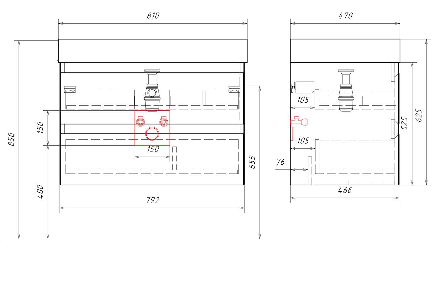 Корпус и фасад изготовлены из МДФ — стабильного материала, устойчивого к перепадам влажности в условиях ванной комнаты. Матовое крашеное покрытие придаёт поверхности однородный, тактильно приятный вид.