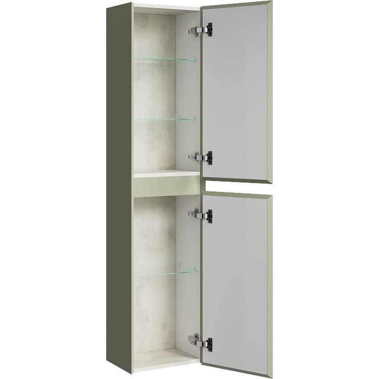 Корпус и фасад изготовлены из МДФ — стабильного материала, устойчивого к перепадам влажности в условиях ванной комнаты. Матовое крашеное покрытие придаёт поверхности однородный, тактильно приятный вид.