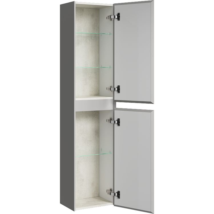 Подвесной шкаф-пенал Geometria – практичное и стильное решение для ванной комнаты, сочетающее в себе удобство хранения, долговечность материалов и чистоту линий, что способствует созданию аккуратного и организованного пространства.