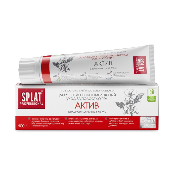 Зубная паста SPLAT Professional «Актив» (ACTIVE) комплексно ухаживает за зубами и чувствительными деснами, применяется для профилактики пародонтита. Экстракты байкальского шлемника, бадана и спирулины оказывают мощное противовоспалительное действие. Витамины А и Е способствуют заживлению мягких тканей полости рта. Глицерофосфат кальция укрепляет эмаль. Фторид-ионы эффективно защищают от кариеса. Отбеливающий комплекс Sp.White system бережно очищает и полирует эмаль до блеска.