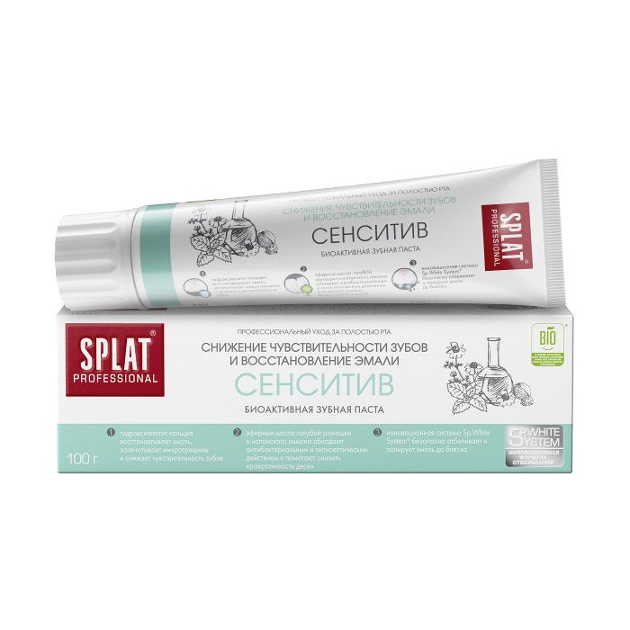 Зубная паста SPLAT Professional «Сенситив» (SENSITIVE) укрепляет эмаль, снижает чувствительность и кровоточивость десен. Натуральный фермент папаин в сочетании с компонентом полидон расщепляют налет и препятствуют его дальнейшему образованию. Инновационный комплекс Sp.White System безопасно отбеливает зубы. Гидроксиапатит восстанавливает эмаль, восполняет потерю минералов и снижает чувствительность зубов. Эфирные масла ромашки и испанского лимона снижают кровоточивость десен. Растительный антисептик Biosol защищает от кариесогенных бактерий. Паста сертифицирована по стандарту Халяль.