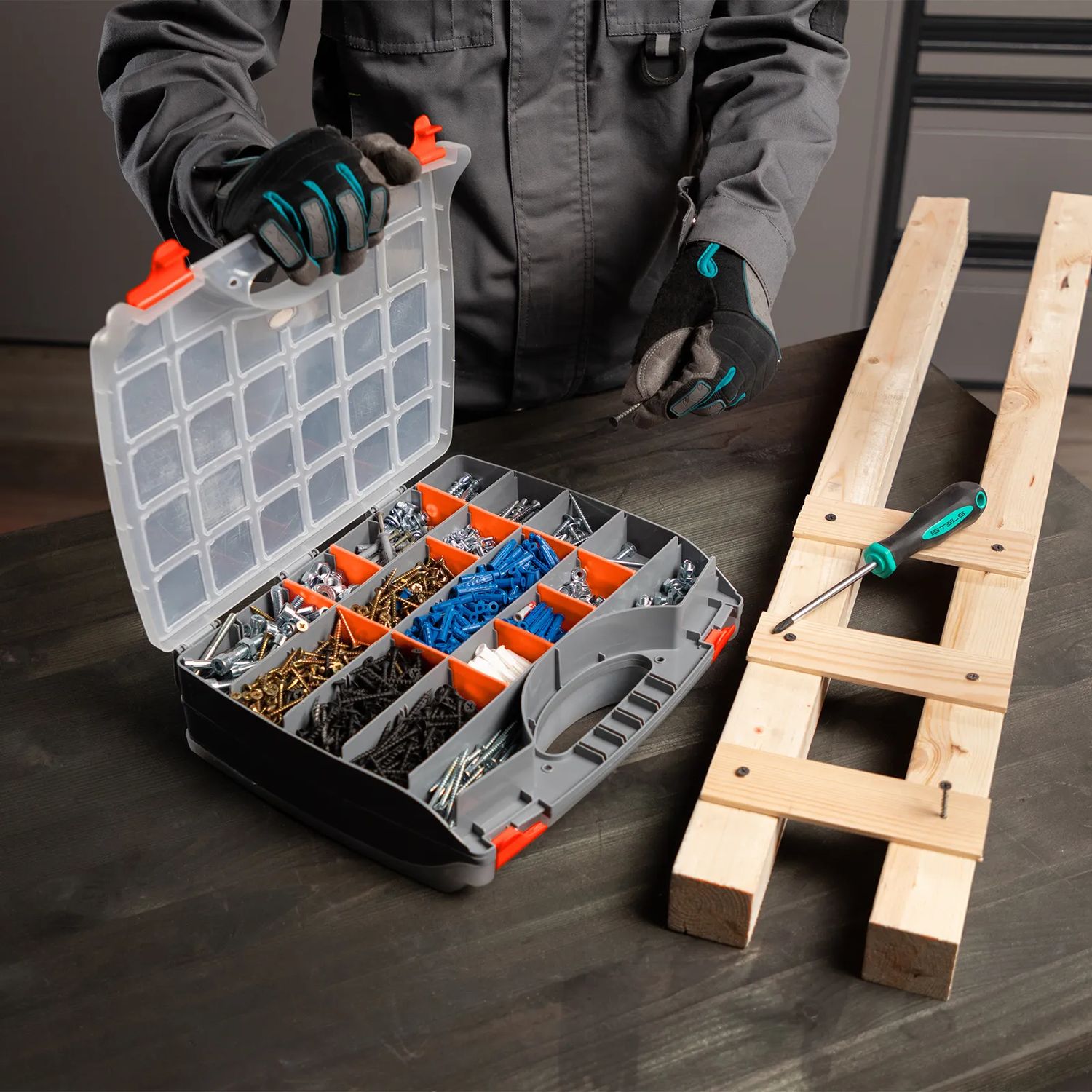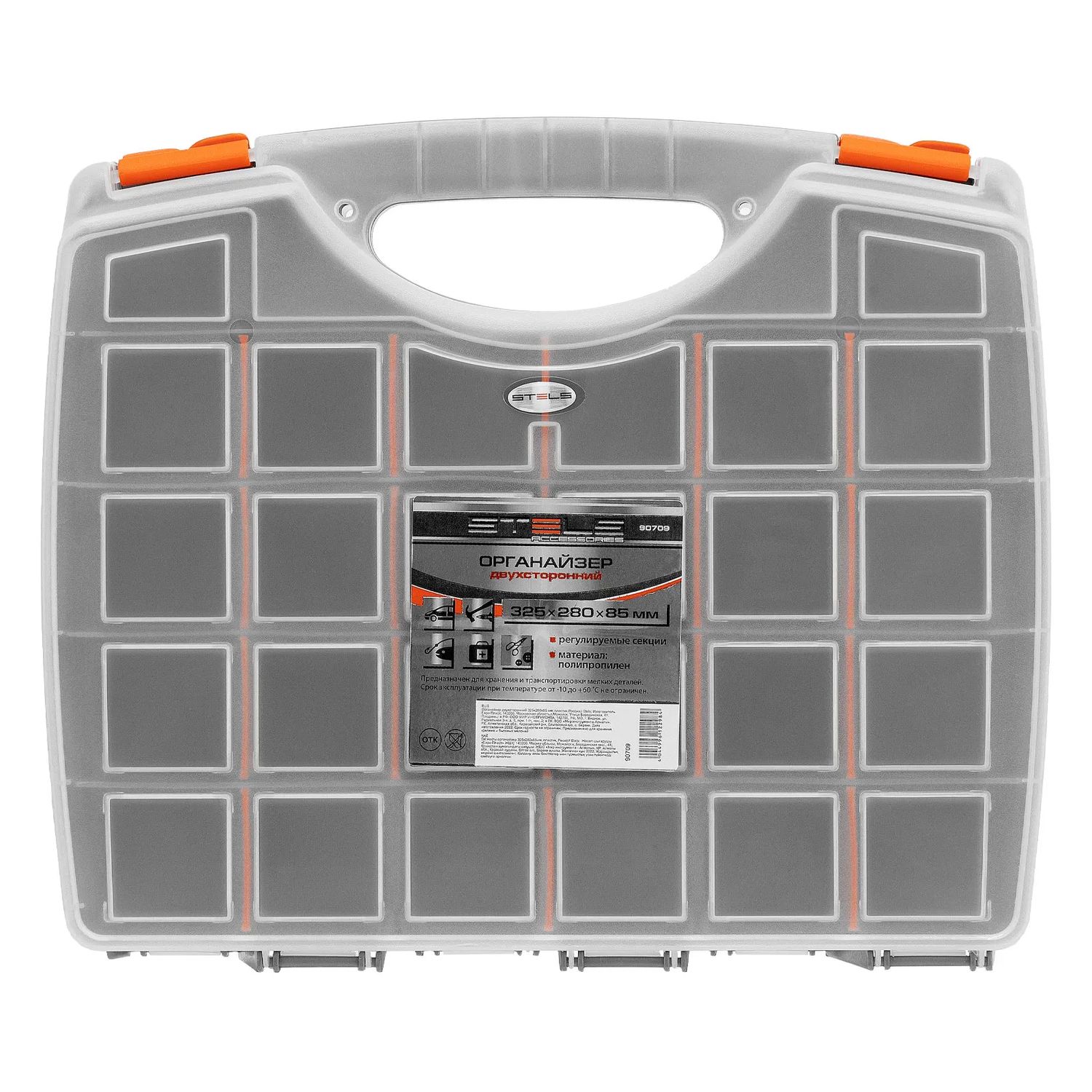 Двухсторонний органайзер из пластика Stels 90709 размером 325х280х85 мм пригодится в хозяйстве и мастерской для хранения крепежных элементов, принадлежностей для рукоделия, снастей и т.д. Он обеспечивает быстрый доступ к предметам, не допуская их перемешивания и утери.