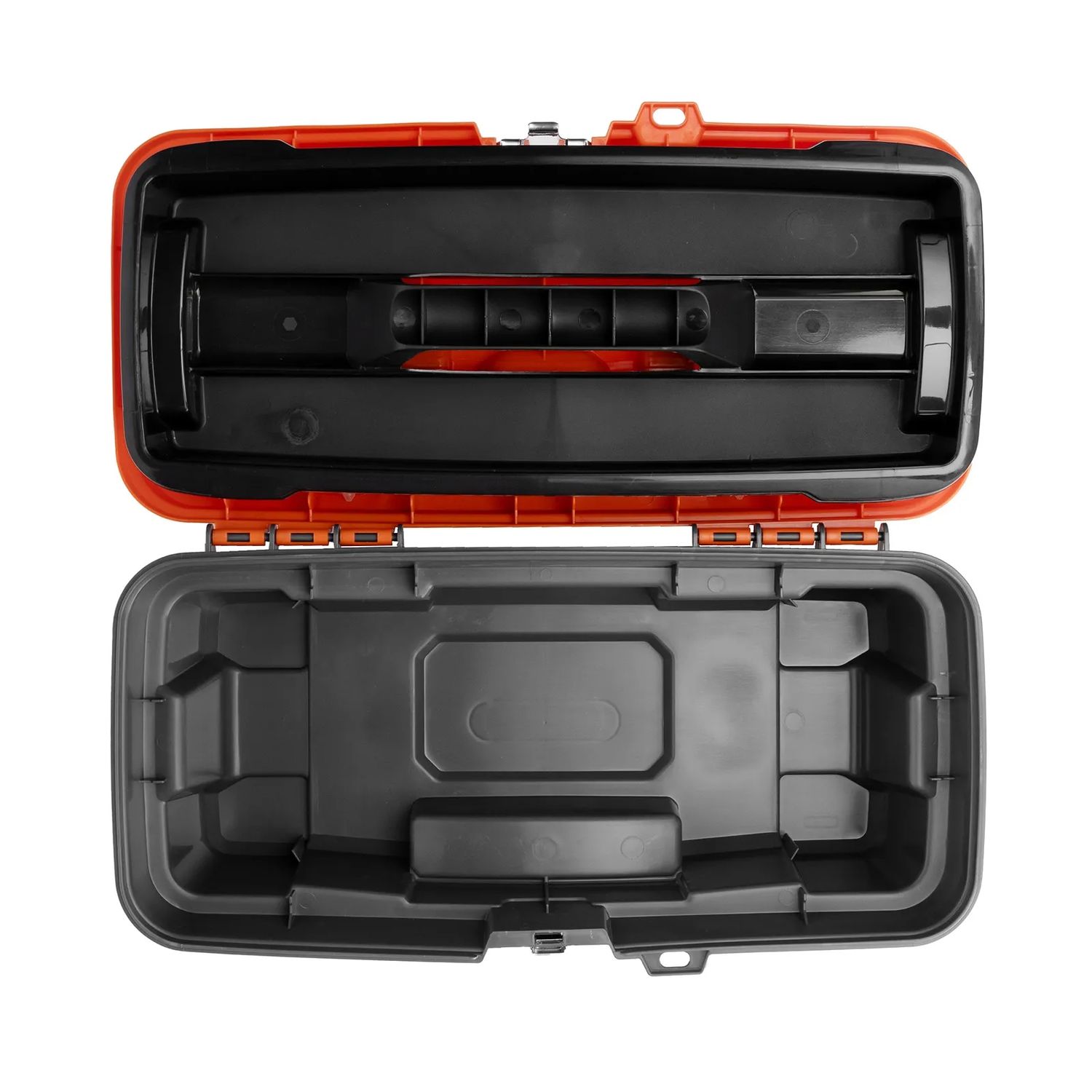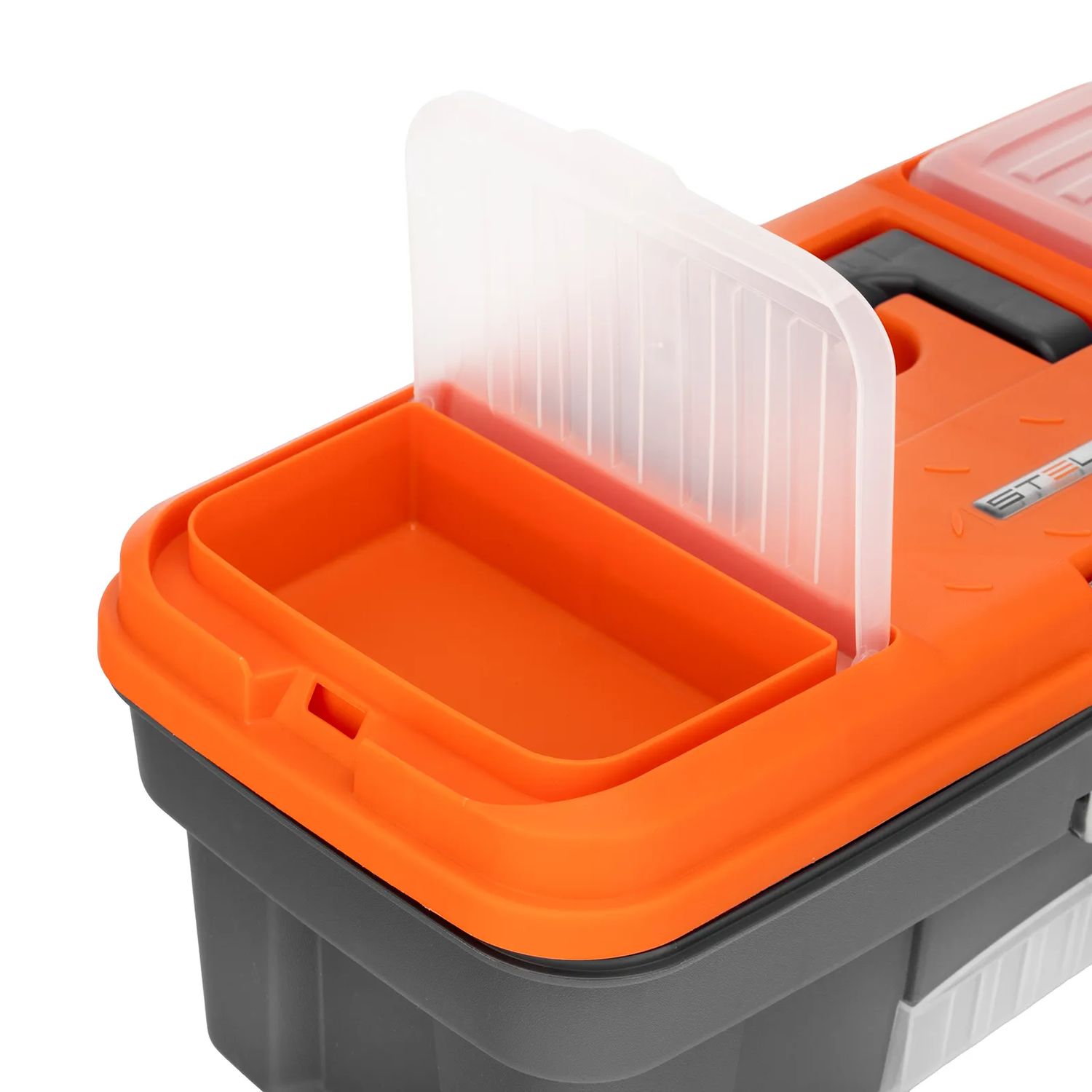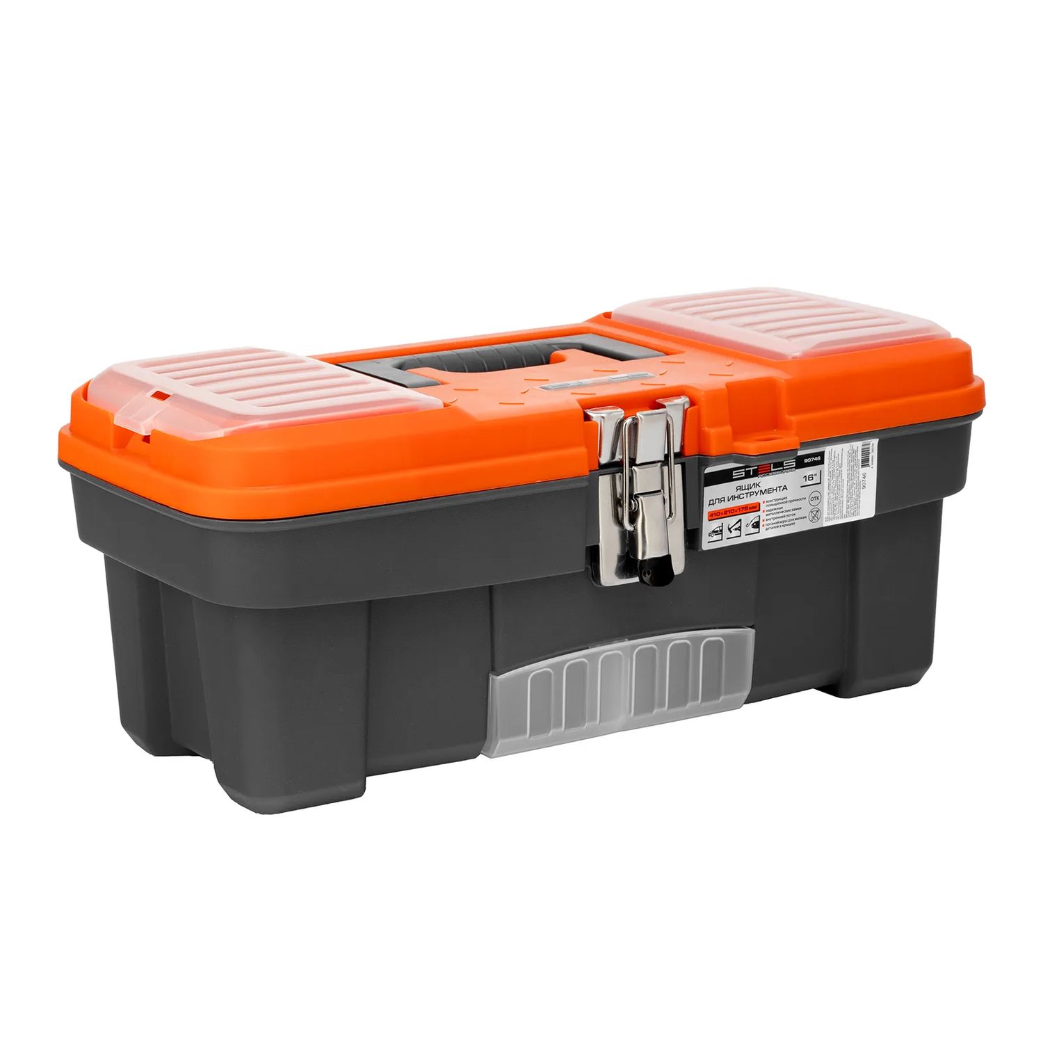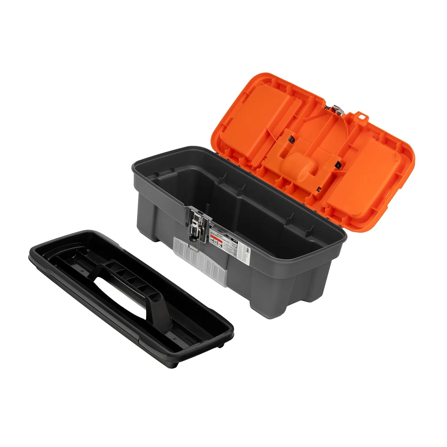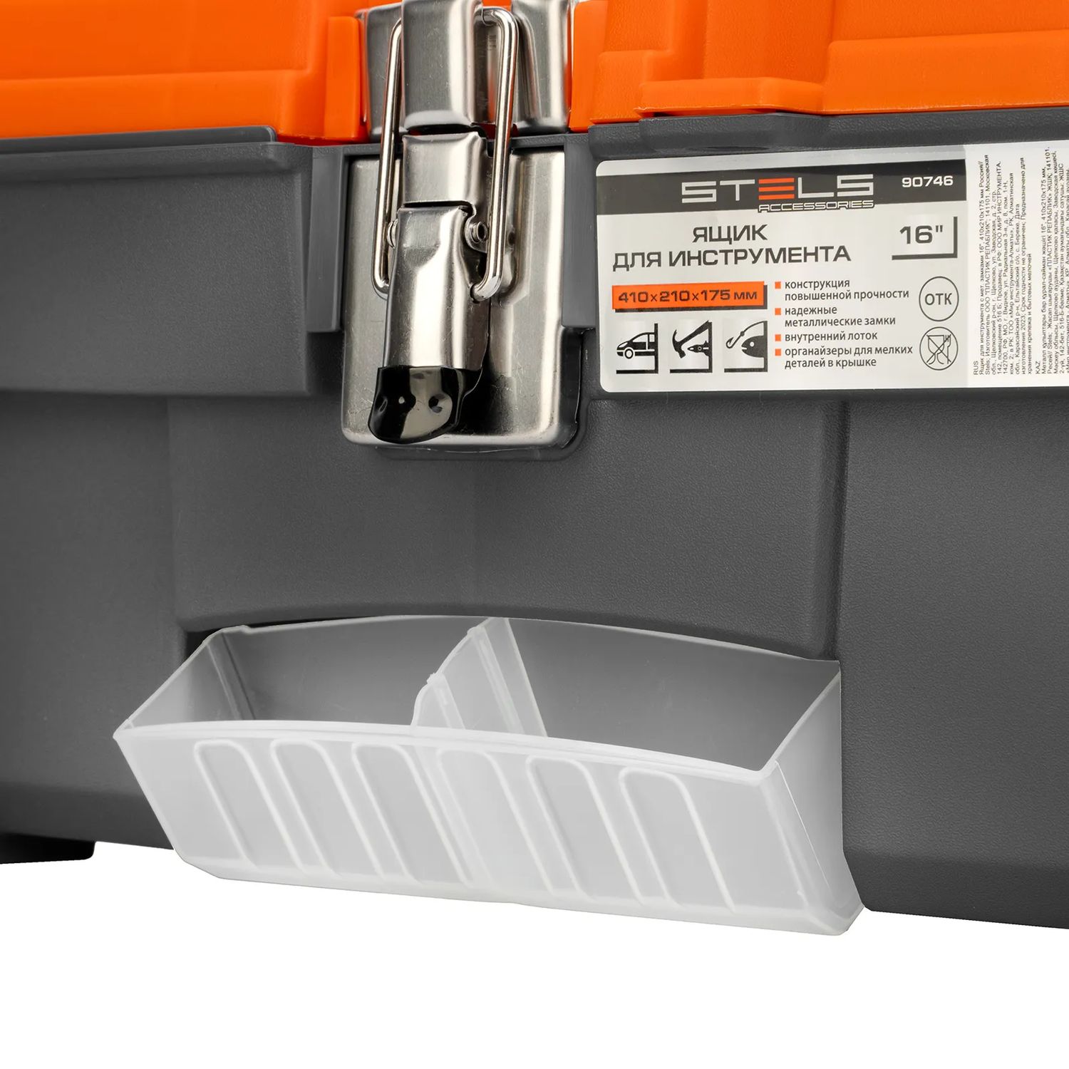Ящик для инструмента Stels 90746 размером 16" с металлическими замками — альтернатива коробке для инструментов. В нем можно расположить ручной инструмент, крепеж, хозяйственные мелочи, а также рыболовные снасти. В крышке имеются встроенные органайзеры, внутри ящика — выкидной лоток с отсеками для мелких деталей, что увеличивает функциональность изделия. Ящик удобно брать в поездки, также он пригодится дома, на даче или в гараже.
