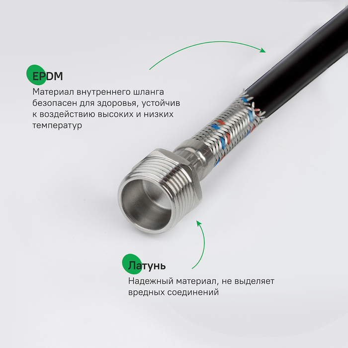 - внутренний шланг из EPDM (пищевая резина) безопасен для здоровья человека, устойчив к воздействию высоких температур (до +95°)