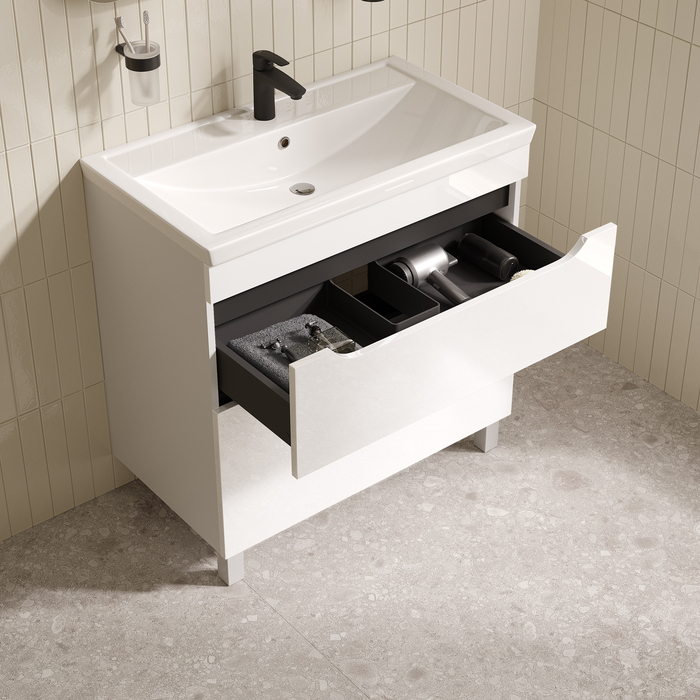 Напольная тумба для ванной Ray с умывальником и выдвижными ящиками – универсальная и практичная мебель, которая будет отлично смотреться в любом современном интерьере. Сочетание белого цвета, светло-серых элементов фасада и тёмно-серых ящиков создаёт стильный дизайн вне времени. У тумбы увеличенная высота, что делает её более вместительной и удобной.