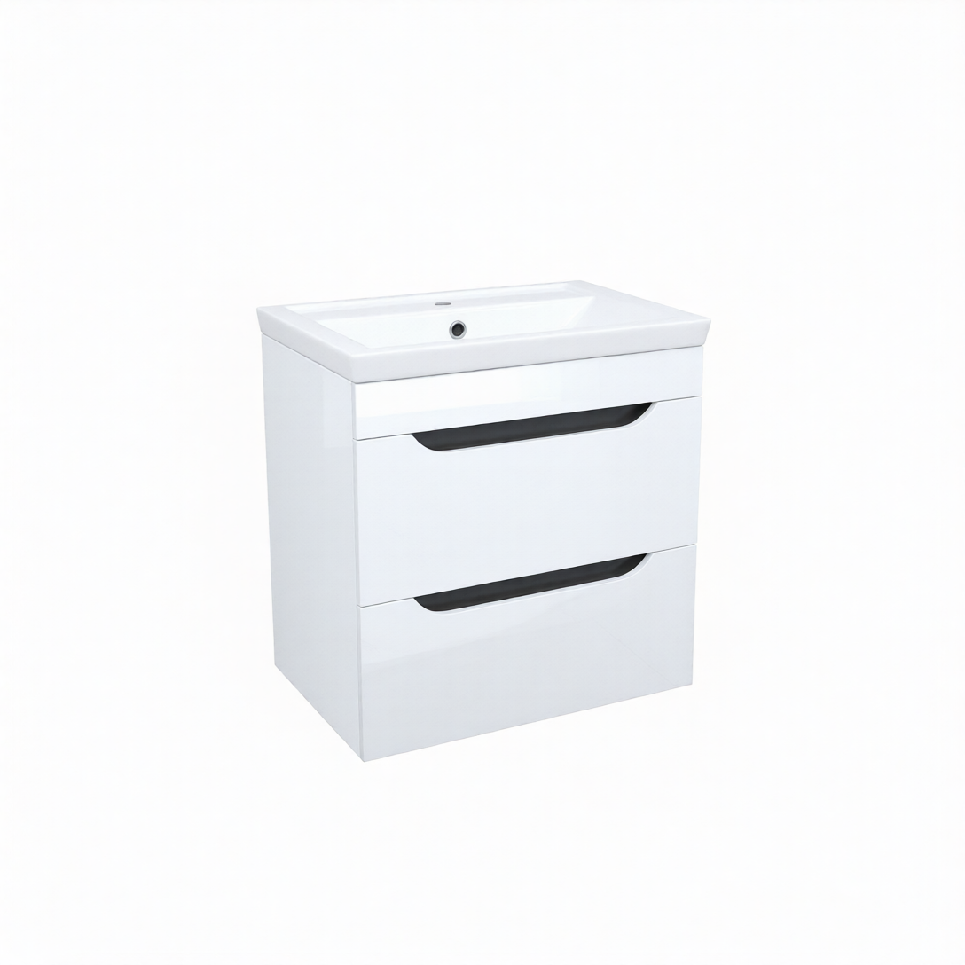 Компактная подвесная тумба для ванной Ray с умывальником и выдвижными ящиками – универсальная и практичная мебель, которая будет отлично смотреться в любом современном интерьере. Сочетание белого цвета, светло-серых элементов фасада и тёмно-серых ящиков создаёт стильный дизайн вне времени. У тумбы увеличенная высота, что делает её более вместительной и удобной.