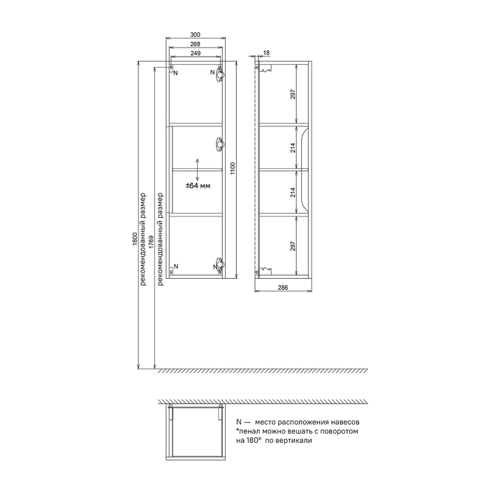 Четыре регулируемых навеса рассчитаны на большой вес до 50 кг и позволяют установить пенал с открытием дверок в левую или правую сторону.